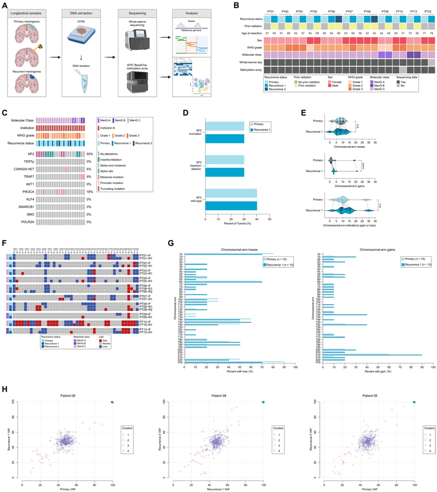 (A) 对 MRM 患者的纵向匹配的原发性和复发性 FFPE 样本进行 WES 和甲基化阵列分析。(B) 11 个原发性、11 个首次复发性和 2 个二次复发性病变的患者信息。(C) 来自 10 个原发性和匹配的复发性对的 WES 的脑膜瘤文献中常见的非同义基因组变异。(D) 对 (C) 中的NF2变异进行量化,显示对于任何特定变异类型,原发性和首次复发之间没有显著差异。(E) 原发性和匹配的首次复发肿瘤之间的臂级拷贝数差异。(F) 10 名患者原发性和匹配的复发性肿瘤的染色体臂增加和丢失。(G) 直方图表示原发性和首次复发 MRM 之间的染色体臂总增加和减少。(H) 使用来自代表性患者的变异等位基因频率 (VAF) 对全外显子组数据进行亚克隆分析。