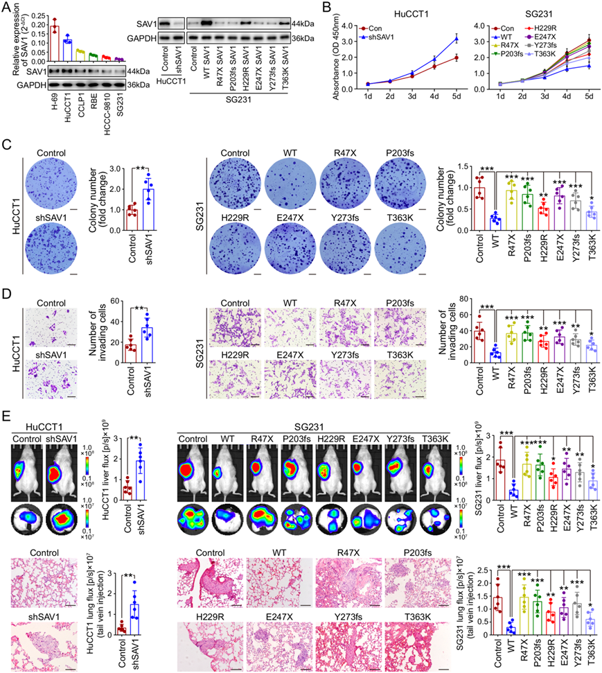 (A) qRT-PCR 和免疫印迹分析。(B) 与对照组相比,SAV1 敲低后 HuCCT1 细胞和表达野生型或突变型 SAV1 的 SG231 细胞的增殖。(C) 与对照组相比, SAV1 敲低后 HuCCT1 细胞和表达野生型或突变型 SAV1 的 SG231 细胞的克隆形成活性。(D) 与对照组相比,SAV1 敲低后 HuCCT1 细胞和表达野生型或突变型 SAV1 的 SG231 细胞的侵袭情况。(E) 小鼠肝肿瘤和肺转移的代表性生物发光图像,以及肺转移性结节的 H&E 染色图像。