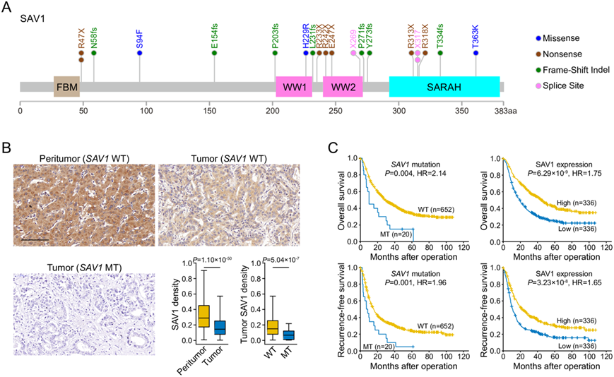 (A) 本研究确定的SAV1突变位点位置示意图。(B) 具有野生型 SAV1 或突变型 SAV1 (R47X) 的肿瘤周围组织和肿瘤组织中的代表性 SAV1 染色。(C) Kaplan -Meier 生存分析显示基于SAV1突变和表达水平的总生存率和无复发生存率。