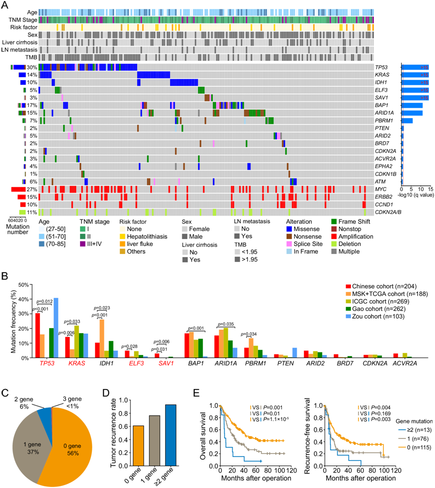 (A) 显示了13 个具有统计学显著突变水平的基因。(B) 比较队列中的 204 个 ICC 与其他队列的 ICC 之间 13 个显著突变基因的突变频率。(C) 204个 ICC 携带TP53、KRAS、ELF3和SAV1突变的比例。(D) 携带不同数量突变基因(TP53、KRAS、ELF3和SAV1)的 HCC 患者的肿瘤复发率。(E) Kaplan -Meier生存分析显示基于TP53、KRAS、ELF3和SAV1突变的总生存期和无复发生存期。