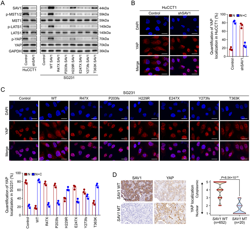 (A) 在 SAV1 表达改变后,ICC 细胞中 p-YAP、YAP 和 YAP 上游激酶 pMST1/2、MST1、pLATS1 和 LATS1 的表达。(B-C) 疫荧光染色显示所示细胞中的亚细胞 YAP 定位。(D) 具有野生型或突变型SAV1的肿瘤组织中的代表性 SAV1 和 YAP 染色。