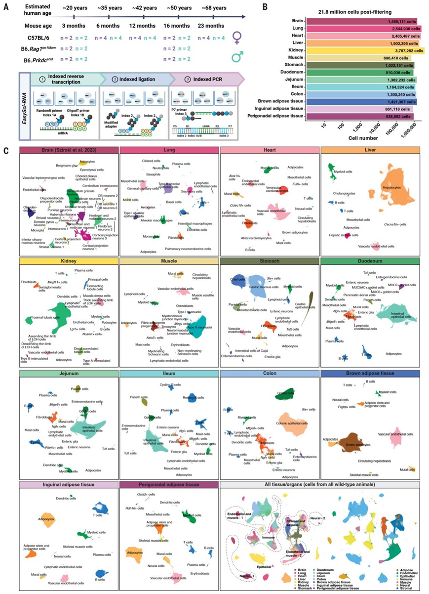 (A)上:样本采集过程示意图,详细说明了研究中使用的各种年龄、性别和基因型(包括野生型和免疫缺陷小鼠)。下:流程图说明通过EasySci进行组合索引的scRNA-seq实验程序。(B) 对数比例尺条形图描绘了质量过滤后从每个器官或组织中分析出的高质量细胞数量。(C) UMAP 图显示每个器官/组织的细胞异质性,细胞按已识别的主要细胞类型用颜色编码。