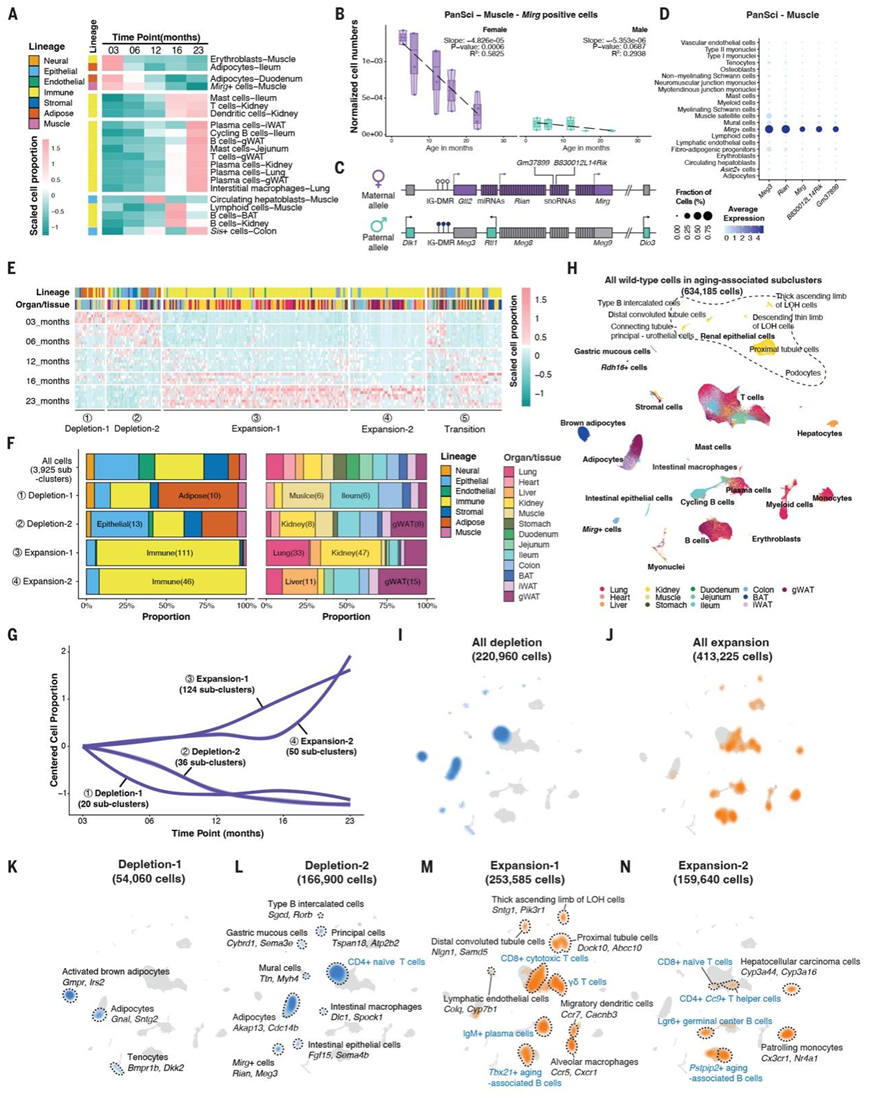 (A) 热图显示了五个生命阶段中与衰老相关的主要细胞类型的分数变化。(B) 箱线图描绘了不同年龄段雌性(左)和雄性(右)小鼠肌肉组织中标准化Mirg + 细胞计数的分数变化。(C) Dlk1-Dio3 基因座示意图,突出显示Mirg+ 细胞标记基因。(D) 点图显示PanSci肌肉数据集中的标记基因表达。(E) 热图显示指定年龄组内每个重复的衰老相关亚聚类的缩放比例。(F)堆叠条形图表示每个动态变化中不同谱系和器官/组织的衰老相关亚群的比例。(G)线图显示每个衰老动态中标准化的细胞比例变化,其中 Loess 回归线以初始年龄点为中心。(H)来自衰老相关亚群的 634185 个野生型细胞的 UMAP 可视化,按器官/组织着色。(I-N)密度图显示与衰老相关的亚聚类的分布。