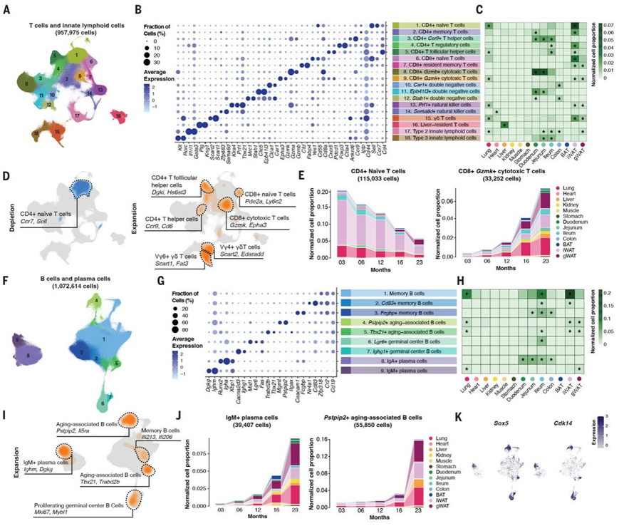 (A) UMAP 可视化了各个器官/组织中的 957975 个 T 细胞和先天淋巴细胞 (ILC),并按聚类ID 着色。(B) 点图显示了 T 细胞和 ILC 亚型的标记基因表达。(C) 热图显示每个 T 细胞和 ILC 亚型在不同器官/组织中的归一化和缩放分布。(D) 密度图突出显示了衰老过程中显著减少(左)和扩增(右)的 T 细胞和 ILC 亚聚类的分布,以及它们各自的标记基因。 (E) 堆叠条形图描绘了野生型细胞中每个器官/组织内CD4+ 幼稚 T 细胞(左)和 CD8+ Gzmk + 细胞毒性 T 细胞(右)的比例,按器官和年龄组标准化。(F) UMAP 可视化器官/组织中的 1072614 个 B 细胞和浆细胞,根据聚类 ID 着色。(G) 点图显示 B 细胞和浆细胞亚型的标记基因表达,颜色表示平均表达,点大小反映细胞表达百分比。(H) 热图说明器官/组织中每个 B 细胞和浆细胞亚型的标准化和缩放分布。所有五个年龄组的汇总细胞数量在每个组织内进行标准化,然后计算为组织间的比例。星号标记相对于其余组织在给定组织中的显著富集。(I) 密度图显示与衰老相关的 B 细胞和浆细胞亚聚类的分布,随着衰老而显著扩增,并用不同的标记基因注释。(J) 堆积条形图显示每个野生型器官/组织中 IgM+浆细胞(左)和Petpip2 +衰老相关 B 细胞(右)的扩增。(K) UMAP 可视化显示Sox5和Cdk14在扩增的 B 细胞和浆细胞群中广泛表达。