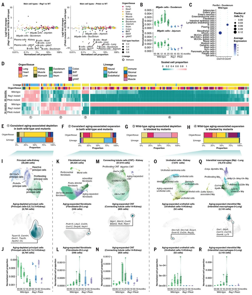 (A) 散点图比较 C57BL/6 野生型小鼠与Rag1(左)或Prkdc(右)突变体之间主要细胞类型的比例变化。免疫细胞谱系以黑色圆圈突出显示,并标记了显著变化。(B) 箱线图说明野生型和突变型小鼠在生命阶段中十二指肠(上)和空肠(下)中 Mfge8+细胞的比例变化。(C) 点图展示PanSci十二指肠数据集中Cxcl13及其受体Cxcr5的表达,按平均基因表达着色,并按表达这些标志物的细胞百分比调整大小。 (D) 热图可视化了C57BL/6 野生型和免疫缺陷突变体中 3 至 16 个月之间与衰老相关的亚聚类(如图 3所示)的分数变化,其中层次聚类揭示了四种不同的动态模式。(E-H) 堆叠条形图显示了每种动态模式中来自不同谱系和器官/组织的与衰老相关的亚聚类的比例。(I-J)肾脏主细胞案例研究:39286 个肾脏主细胞的 UMAP 可视化和密度图描绘了衰老耗尽的主细胞的分布和标记基因;箱线图详细显示了野生型和突变型小鼠在不同生命阶段中衰老耗尽的主细胞的群体变化。(K-L) 肺成纤维细胞案例研究:85625 个肺成纤维细胞的 UMAP 可视化和密度图描绘了老化扩增的肺成纤维细胞的分布和标记基因;箱线图详细列出了野生型和突变型小鼠在不同生命阶段中老化扩增的肺成纤维细胞的群体变化。(M-N) 肾连接小管细胞案例研究:57619 个肾连接小管细胞 (CNT) 的 UMAP 可视化和密度图显示老化扩增的 CNT 的分布和标记基因;箱线图详细列出了野生型和突变型小鼠在不同生命阶段中老化扩增的 CNT 的群体变化。(O-P) 肾脏尿路上皮细胞案例研究:7670 个肾脏尿路上皮细胞的 UMAP 可视化和密度图显示老化扩增的尿路上皮细胞的分布和标记基因;箱线图详细表示野生型和突变型小鼠在不同生命阶段老化扩增的尿路上皮细胞的群体变化。(Q-R) 肺间质巨噬细胞案例研究:18418 个肺间质巨噬细胞的 UMAP 可视化 [(Q),上] 和密度图显示老化扩增的间质巨噬细胞的分布和标记基因;箱线图详细表示野生型和突变型小鼠在不同生命阶段老化扩增的间质巨噬细胞的群体变化。