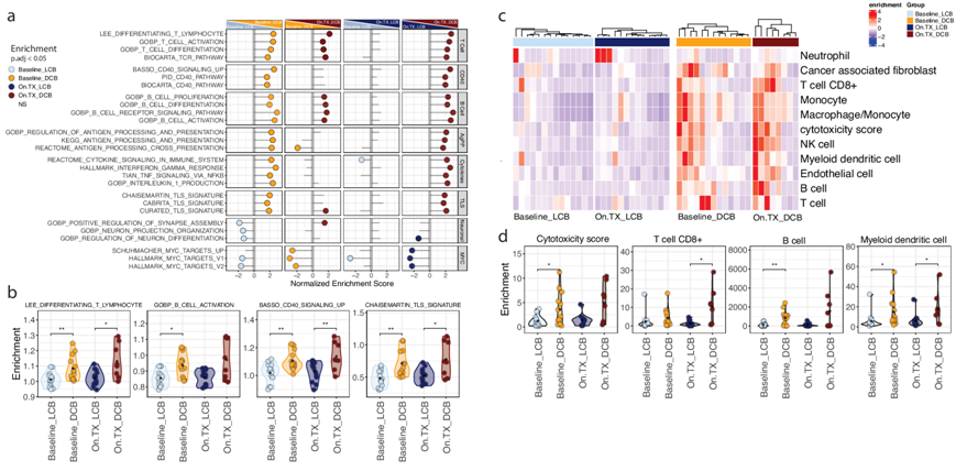 (a) 过对肿瘤转录组数据进行基因集富集分析 (GSEA),发现免疫群体变化在持久临床益处 (DCB) 组中富集,并且与有限临床益处 (LCB) 组相比,这种富集在治疗期间 (On.TX) 进一步放大。(b-d) 基于GSEA的免疫特异性特征分析。