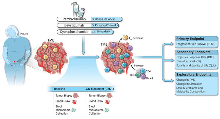 本项研究进行了一项 2 期临床试验 (NCT02853318),将派姆单抗与贝伐单抗相结合,以增加 T 细胞在肿瘤中的浸润,并口服环磷酰胺,以减少调节性 T 细胞的数量。该试验招募了 40 名接受过大量治疗的复发性卵巢癌患者。主要终点无进展生存期延长至中位数 10.2 个月。次要终点显示客观缓解率为 47.5%,30% 的患者在一年以上内疾病得到控制,同时保持了良好的生活质量。本研究对试验患者的样本进行了全面的分子、免疫、微生物组和代谢分析,表明 T 细胞和 B 细胞聚类的增加以及具有氨基酸和脂质代谢的不同微生物模式与出色的临床反应有关。这项研究表明,可以利用免疫环境和宿主微生物组来改善未来免疫治疗试验中的抗肿瘤反应。