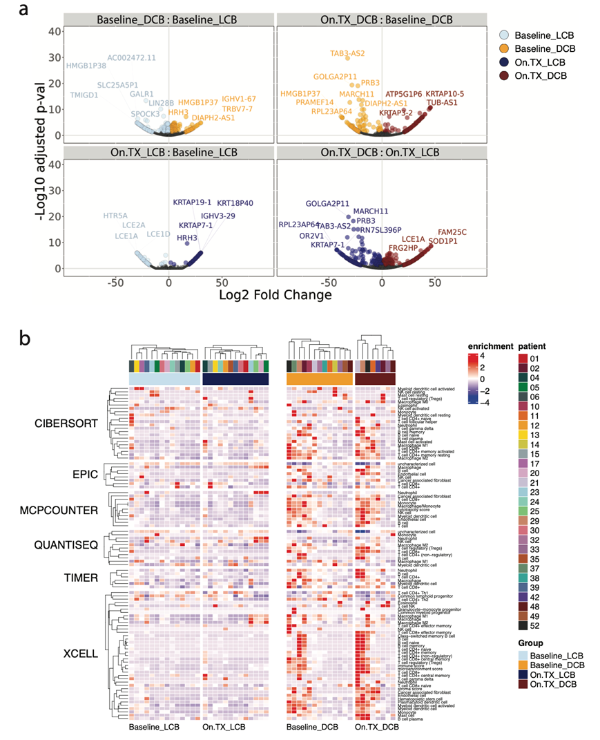 (a)火山图显示显著差异表达基因(DEG)。(b) 与LCB患者相比,DCB患者人群在基线和On-TX时6种不同的免疫反卷积特征的富集。