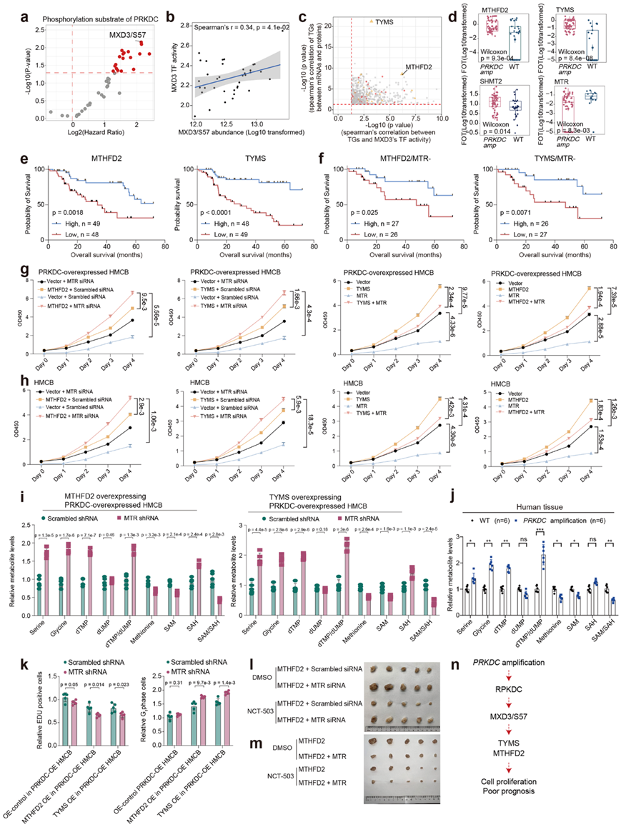 (a) 火山图显示了 PRKDC 磷酸化底物的丰度,可预测黑色素瘤中的 OS。(b) 黑色素瘤中 MXD3 的 TF 活性和 MXD3/S57 丰度的 Spearman 相关性。(c) MXD3 的 TF 活性和 MXD3 的 TG 蛋白表达的 Spearman 相关性(x轴);MXD3 的 TG 的 mRNA 表达和蛋白表达的 Spearman 相关性(y轴)。(d) MTHFD2、TYMS、SHMT2 和 MTR 的表达情况。(e-f)生存分析。 (g-h) HMCB 细胞的增殖情况。(i) HMCB 细胞的代谢情况。(j) 本研究队列中含有PRKDC扩增子和 WT 样本的患者的黑色素瘤组织中的代谢情况。(k) HMCB细胞的DNA合成情况和G1期细胞的数量分析。(l-m) 异种移植肿瘤模型分析。(n) RKDC-MXD3 信号通路的激活与一碳单位富集相结合导致黑色素瘤肿瘤生长的图示。