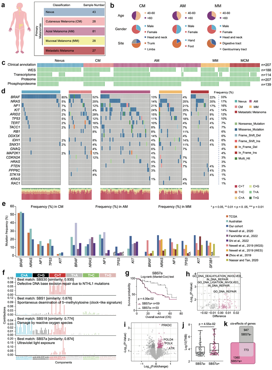(a) 本研究中生成的数据摘要 (b) 本研究中描述的黑色素瘤患者样本的关键人口统计学和组织学特征的饼图。(c) 黑色素瘤多组学分析示意图。 (d) 队列中黑色素瘤热点突变图。(e) 突变频率分析。(f) 相对突变频率分析。(g) 总生存率 (OS) 的 Kaplan-Meier 曲线。(h-i) 火山图显示具有 SBS7a 突变特征的患者的蛋白质通路升高。(j) 肿瘤突变负担 (TMB)分析。(k) 具有和不具有 SBS7a 突变特征的患者中 CNA变化。