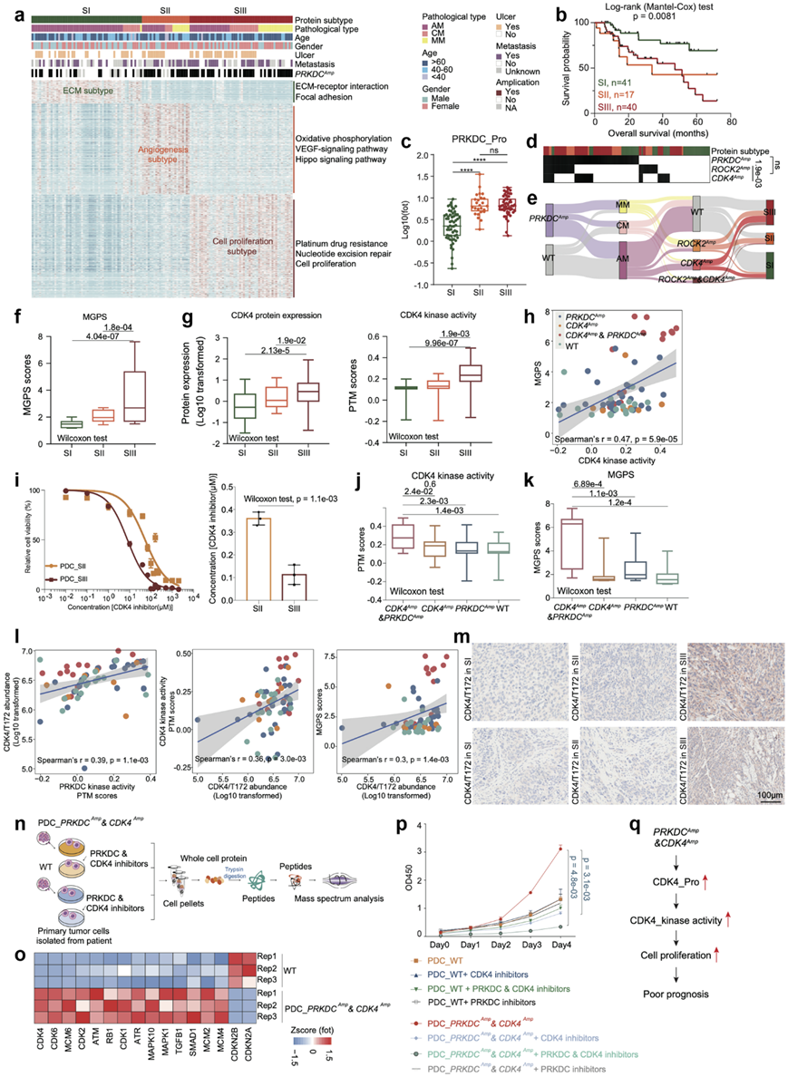 (a) 热图显示了 137 名黑色素瘤患者的临床信息和PRKDC扩增子的频率。(b) 三种蛋白质组亚型与黑色素瘤患者临床结果的关联。(c) 箱线图显示了三种蛋白质组亚型中 PRKDC 的蛋白质表达 。(d) 热图显示了三种蛋白质组亚型中PRKDC、CDK4、ROCK2的扩增频率。(e) 桑基图显示黑色素瘤三种病理亚型和三种蛋白质组亚型中PRKDC、CDK4和ROCK2的扩增频率。(f) 箱线图显示三种蛋白质组亚型中的 MGPS 评分。(g) 箱线图显示三种蛋白质组亚型中 CDK4 的蛋白表达和激酶活性。(h) 黑色素瘤中 CDK4 激酶活性与 MGPS 评分的 Spearman 相关性。 (i) 剂量反应曲线。(j) 箱线图显示了本研究队列中含有CDK4扩增子和PRKDC扩增子、仅PRKDC扩增子或仅CDK4扩增子和 WT 样本的患者的 CDK4 PTM 评分。(k) 箱线图显示了本研究队列中含有CDK4扩增子和PRKDC扩增子、仅PRKDC扩增子或仅CDK4扩增子和 WT 样本的患者的 MGPS 评分。(l) 黑色素瘤中PRKDC激酶活性与CDK4/T172丰度的Spearman相关性(左);黑色素瘤中CDK4/T172丰度与CDK4激酶活性的Spearman相关性(中);黑色素瘤中CDK4/T172丰度与MGPS评分的Spearman相关性(右)。 (m) 免疫组织化学分析。(n)实验流程。(o) 热图显示参与细胞周期的CDK4、CDK6等蛋白质表达在含有CDK4扩增子和PRKDC扩增子的黑色素瘤患者的PDC中上调。(p) PDC 增殖情况。(q) 说明PRKDC-CDK4 信号通路的激活与细胞增殖相结合导致黑色素瘤预后不良。