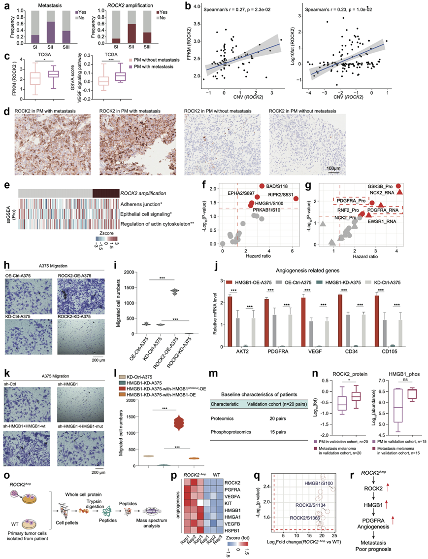 (a) 直方图显示转移和ROCK2扩增的频率。(b) 黑色素瘤中ROCK2拷贝数和ROCK2 mRNA 表达的Spearman 相关性(左);黑色素瘤中ROCK2拷贝数和ROCK2蛋白表达 的 Spearman 相关性 (右)。(c) 黑色素瘤中 ROCK2 的 mRNA 表达和 VEGF 信号通路的 GSVA 评分。(d) 免疫组织化学分析。(e) 热图描绘了在含有ROCK2扩增子的样本中显著升高的通路。(f) 火山图显示了预测黑色素瘤 OS 的磷酸位点的丰度。(g) 火山图显示了预测黑色素瘤 OS 的 HMGB1 的 TG 表达。(h) 通过transwell 证实了 ROCK2 对 A375 细胞迁移的影响。(i) 小提琴图显示不同处理下迁移的 A375 细胞计数。 (j) 箱线图显示了 OE-Control-A375、OE-HMGB1-A375、KD-Control-A375 和 HMGB1-KD-A375 中血管生成相关基因的表达水平。(k) 通过 transwell 确认了 HMGB1 对 A375 细胞迁移的影响。(l) 小提琴图表示不同处理下迁移的 A375 细胞数。(m) 验证队列 1 中患者的基线特征。(n) ROCK2 的蛋白质表达和 HMGB1 的磷酸化丰度。(o)实验流程。(p) 热图显示 ROCK2、VEGFRA、HMGB1 等参与血管生成的蛋白质表达在含有ROCK2扩增子的黑色素瘤患者的 PDC 中上调。(q) 火山图显示具有ROCK2扩增子的黑色素瘤患者中磷酸化显著上调。 (r) 示意图总结了 ROCK2 对血管生成和通过 HMGB1 促进黑色素瘤转移的级联调控作用。