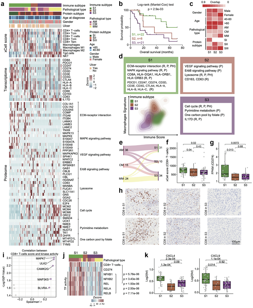 (a) 热图显示了 75 名黑色素瘤患者的三个免疫组中选定的单个 mRNA/蛋白质和通路的细胞类型组成和活性。(b) 三种免疫组与黑色素瘤患者临床结果的关联。(c) 热图显示了免疫聚类(列)与性别、年龄、蛋白质组亚型和不同组织学类型的比较。 (d) 基于不同免疫组的巨噬细胞(y轴)和免疫评分(x轴)的二维密度轮廓图。(e) 桑基图显示了不同组织学类型的免疫聚类之间的比较。 (f) 三个免疫聚类中CD8 + T 细胞的 xCell 评分。(g) 箱线图显示三个免疫聚类中 CD274 的 mRNA 表达。(h) 三个免疫组中 CD8 的 IHC 。(i) 火山图显示了激酶活性与 CD8 + T 细胞的 xCell 评分显著相关的激酶。(j) 热图显示 NFκB 家族的 TF 活性与 CD8 + T 细胞的 xCell 评分呈正相关。(k) 箱线图显示了三个免疫组中 CXCL4 和 CXCL9 的蛋白质表达。