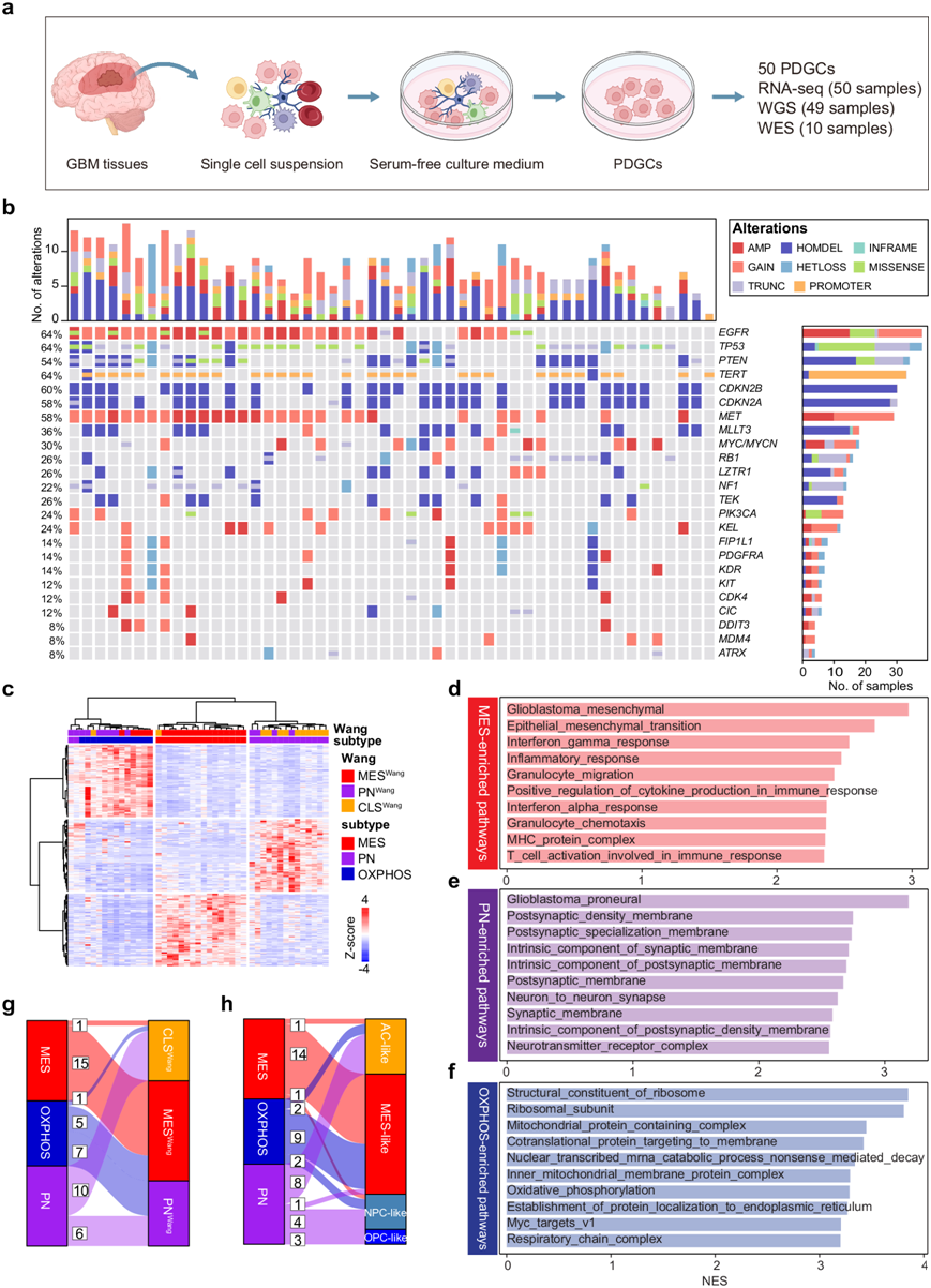 (a) PDGC 实验流程的示意图。(b) Oncoprint显示 50 个 PDGC 的基因组改变。(c) 热图显示亚型特异性特征的表达水平。(d-f) 条形图显示 MES、PN和 OXPHOS亚型的富集通路。