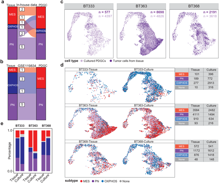 (a-b) Sankey 图显示培养的 PDGC 与其亲本组织之间亚型的变化。(c) 来自组织和培养的 PDGC 的 GBM 肿瘤细胞的均匀流形近似和投影 (UMAP) 可视化,按细胞类型着色。(d) 来自组织和培养的 PDGC 的 GBM 肿瘤细胞的UMAP可视化,按亚型分配着色。(e) 来自组织和培养的 PDGC 的 GBM 肿瘤细胞中每种亚型的百分比。