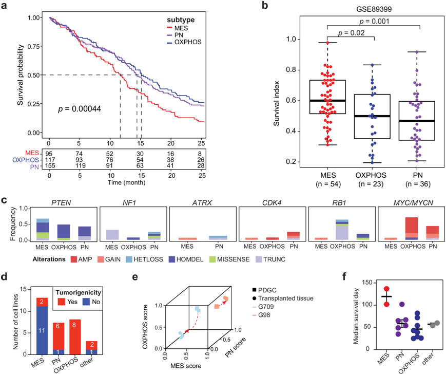 为了评估不同亚型PDGC的致瘤能力,他们将5×105个PDGC移植到免疫缺陷小鼠的脑内。大多数PN(6/7)和OXPHOS(8/8)亚型的PDGC能够在裸鼠体内形成颅内肿瘤(图 3d)。虽然MES亚型的GBM患者(与PN和OXPHOS亚型相比)总生存期最短(图 3a),但MES亚型的PDGC具有最低的致瘤性。他们对来自G98和G709移植瘤的细胞培养物进行了RNA-seq,发现G709的亚型从MES转变为PN(图3e)。此外,移植了MES亚型PDGC的荷瘤小鼠比移植了非MES亚型PDGC的荷瘤小鼠的中位生存时间更长(图3f)。总的来说,这些结果显示了三种亚型在放射治疗敏感性、总体生存、基因组改变和致瘤能力方面的差异。