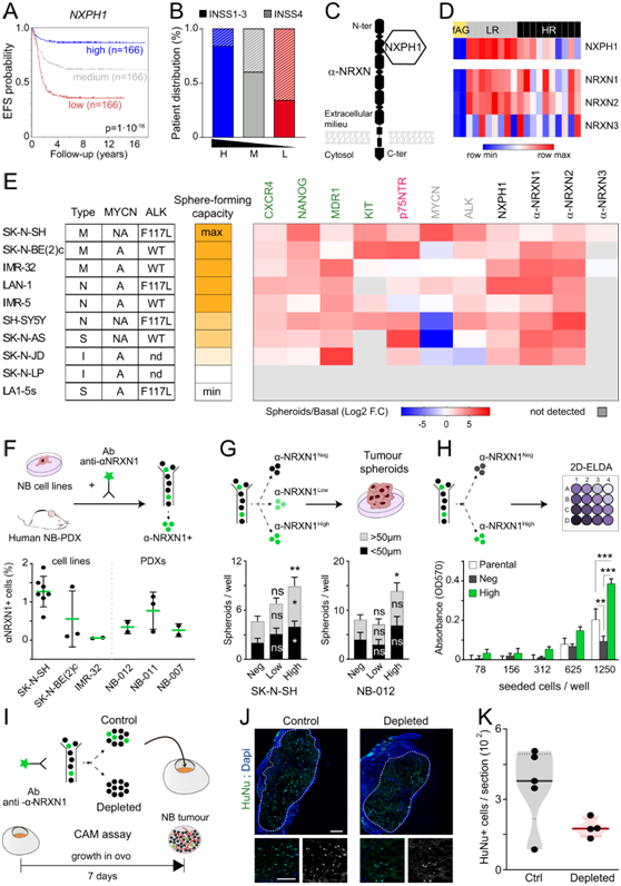 (A) 根据 NXPH1 mRNA 表达(高、中或低),SEQC 队列的 EFS 概率细分为 3 组。(B) 基于 NXPH1 转录本水平和 INSS 肿瘤分期(1-3 期或 4 期)的 SEQC 队列分布。(C) NXPH1 及其 α-NRXN 受体的示意图。 (D) fAG、LR-NB 和 HR-NB 样本中 NXPH1 和 NRXN1-3 表达的热图。(E) 干细胞标记物(绿色)、神经嵴细胞标记物(粉色)、致病性 NB 标记物(灰色)、NXPH1 和 α-NRXN1-3(黑色)的转录水平热图。 (F) 使用抗 α-NRXN1-Alexa488 抗体通过 FACS 纯化的 3 个 NB 细胞系和 3 个 PDX 样品中 α-NRXN1+ 细胞的平均百分比。(G) 细胞的直径 < 或 > 50 µm 的球体的平均数 (H) 体外极限稀释测定。(I) 鸡绒毛尿囊膜 (CAM) 测定的图示。(J-K)免疫荧光和HuNu +细胞平均数量分析。
