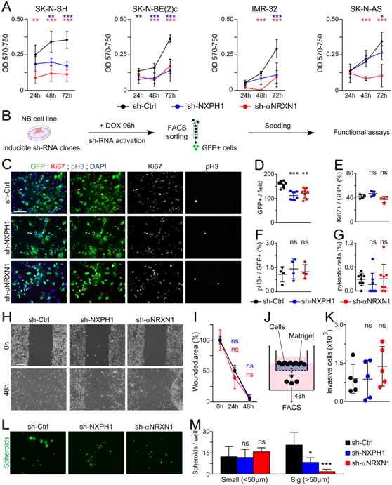 为了确定 NXPH1/α-NRXN 信号传导是否确实是 NB 生长所必需的,他们生成了 NB 细胞的稳定克隆,这些细胞持续表达针对人NXPH1或α-NRXN1 的sh-RNA。表达sh-RNA靶向NXPH1或α-NRXN1的4个不同克隆的SK-N-SH细胞在体外3天后均表现出细胞活力严重下降,1周后完全停止生长(图4A)。在SK-N-BE(2)c、IMR-32和SK-N-AS NB细胞中敲除NXPH1或α-NRXN1也获得了类似的结果。为了尽量减少细胞活力的下降,他们产生了SK-N-SH和IMR-32细胞的诱导克隆,其中sh-RNA和eGFP的产生依赖于多西环素(doxycycline)(图4b)。MTT试验和增殖和细胞死亡的免疫荧光分析证实,在这些诱导克隆中,由NXPH1和α-NRXN1敲低引起的生长停滞最小(图4C-G)。体外transwell实验显示,NXPH1或α-NRXN1敲低对SK-N-SH或IMR-32细胞的迁移或侵袭能力无明显影响(图4H-K)。然而,当在限制性培养条件下生长时,这些sh-NXPH1和sh-αNRXN1细胞仍保持着减弱的成球能力(图4L-M),这表明NXPH1/α-NRXN1抑制可能会损害NB细胞的干性。