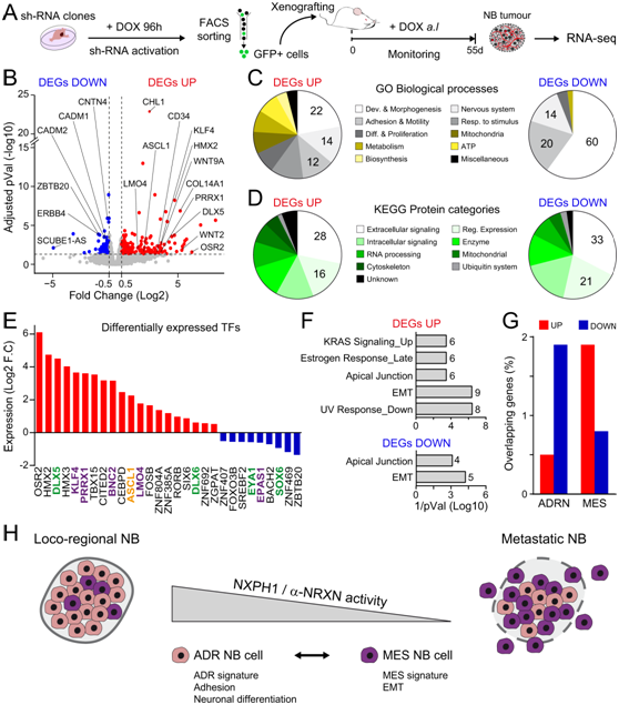 (A) 用于评估 NB 肿瘤中 NXPH1 抑制引起的转录变化的实验设计。(B) 火山图显示 sh-NXPH1和 sh-Ctrl细胞生长的肿瘤之间的 DEG。(C-D) GO分析和KEGG分析。(E) 转录因子 (TF) 表达分析。(F) Hallmark 特征显著丰富,与上调和下调 DEG 列表相关。 (G) 在上调和下调的 DEG 中检测到 ADRN 和 MES 状态的基因的比例。(H) 模型显示NXPH1/α-NRXN信号活性的下调和/或低活性促进NB细胞从肾上腺素能状态向间充质状态的转化,从而增强它们形成器官性转移的能力。