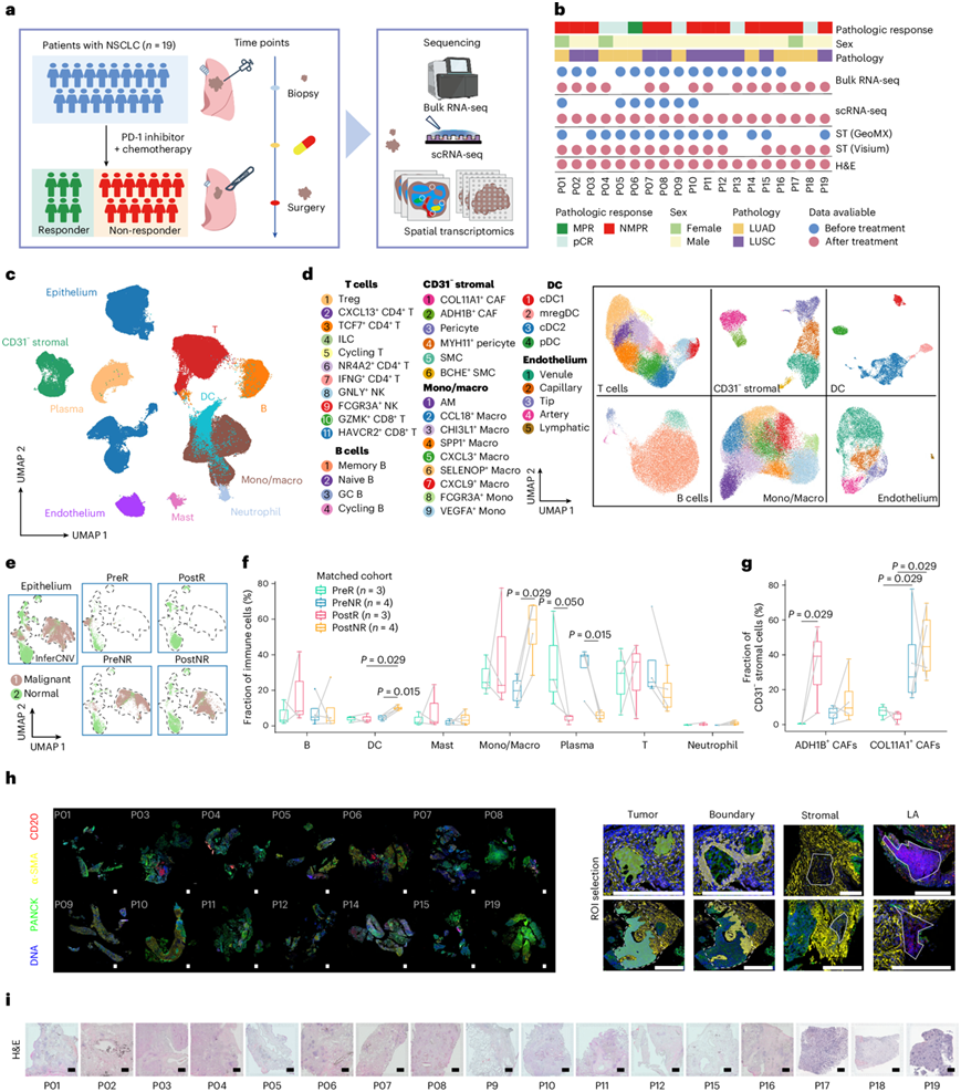 (a) 研究设计的工作流程。(b) 参与本研究的每位患者的样本信息。每个相关检测的点表示数据可用性。(c-d) 样本中所有 232080 个细胞的 UMAP 图。(e) 上皮细胞的 UMAP 图。(f) 箱线图展示了基线(治疗前)和治疗后来自三名应答者和四名无应答者的匹配样本中免疫细胞亚型的比例。(g) 箱线图显示基线和治疗后来自三名应答者和四名无应答者的匹配样本中 CD31−基质谱系中成纤维细胞亚型的比例。(h) 空间转录组学分析。(i) 对接受免疫治疗的队列(n = 17)中的标本进行H&E 染色。
