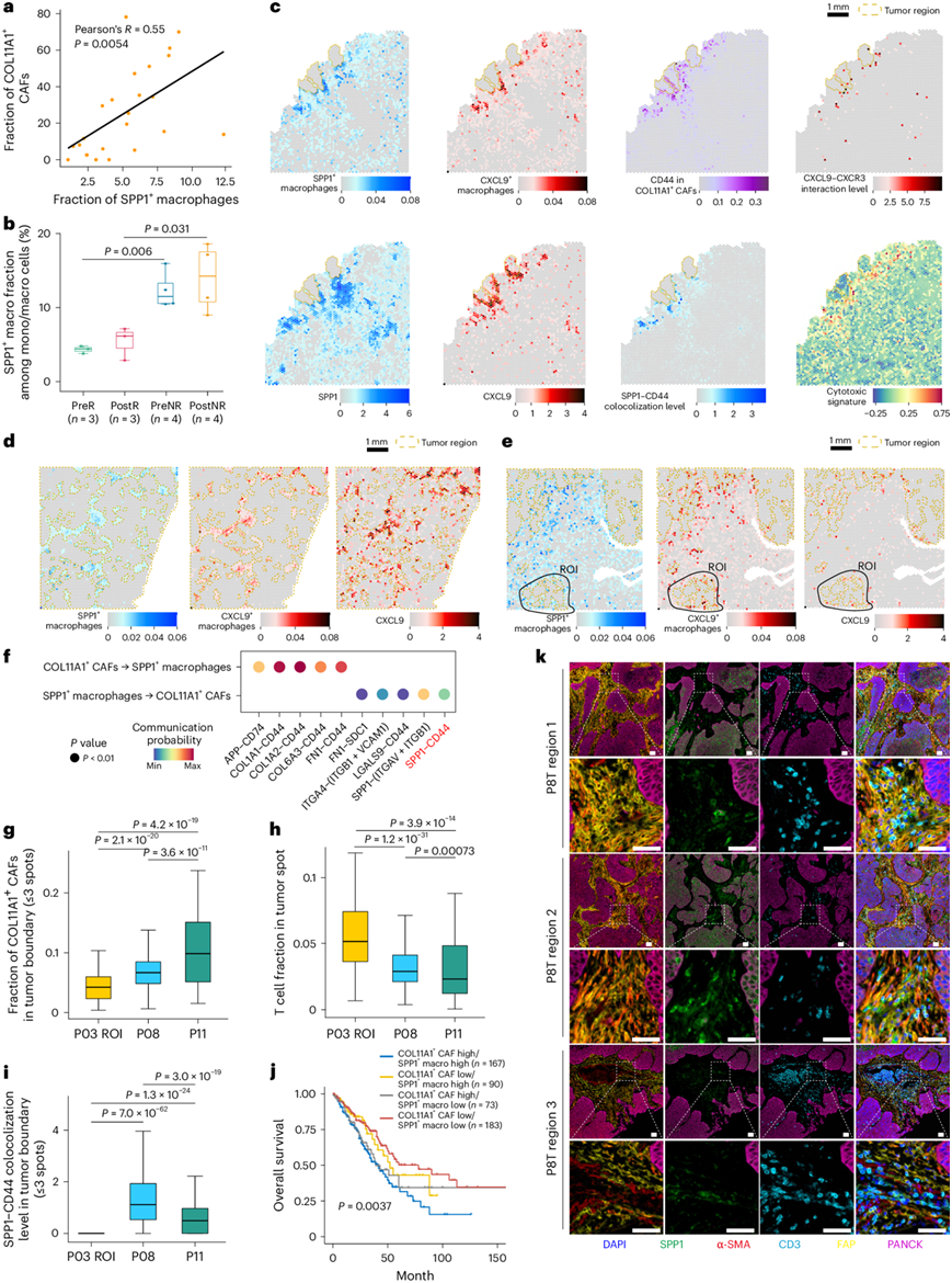 (a) 散点图显示单细胞样本中COL11A1+ CAF 的比例与SPP1+巨噬细胞的比例之间存在显著的正相关性。(b) 箱线图显示治疗前后三名应答者和四名无应答者的匹配样本中 SPP1+巨噬细胞的比例。(c) P11(NMPR)分离肿瘤载玻片中肿瘤斑点、SPP1 +巨噬细胞和 CXCL9 +巨噬细胞的空间分布、COL11A1+ CAF 特异性 CD44 表达、SPP1 和 CXCL9 的表达以及 SPP1 与 CD44 之间和 CXCL9 与 CXCR3 之间的共定位水平。(d) P08(NMPR)肿瘤核心载玻片中肿瘤斑点、SPP1+巨噬细胞和 CXCL9 +巨噬细胞的空间分布以及 CXCL9 的表达。(e) P03侵袭性边缘载玻片中肿瘤斑点、SPP1+巨噬细胞和 CXCL9 +巨噬细胞的空间分布以及 CXCL9 的表达。(f) 细胞间相互作用分析。(g-i) 箱线图比较了 COL11A1 + CAF低区域和两个 COL11A1 + CAF 包膜区域中肿瘤边界处 COL11A1 + CAF的分数、T 细胞的分数和 SPP1-CD44 的共定位水平。 (j) TCGA-LUAD 队列的 Kaplan-Meier 生存曲线。(k) 接受 ICB 化疗的另一例 NSCLC 样本 (P8T) 的多重免疫荧光染色。