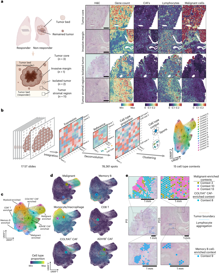 (a) 左:组织取样示意图。右:H&E 染色。 (b) 定义 15 种细胞类型环境的示意图。(c) 基于细胞类型环境的 15 种空间转录组学点的 UMAP。(d) 基于细胞类型环境的 UMAP突出显示恶性细胞、记忆 B 细胞、单核细胞/巨噬细胞、CD8 + T 细胞、COL11A1 + CAF 和 ADH1B +CAF。(e) 细胞类型的空间映射展示了三种恶性细胞环境、COL11A1+ CAF 富集背景和记忆 B 细胞富集环境的空间分布。