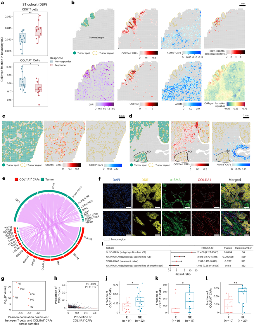 (a) 箱线图显示 治疗前应答者和无应答者边界 ROI 中的 T 细胞和 COL11A1+ CAF 的比例。(b) 来自P11 (NMPR)的分离肿瘤样本中肿瘤点、COL11A1 + CAF 和 ADH1B+ CAF 的空间分布、DDR1、COL11A1 和 ADH1B 的表达水平、DDR1-COL11A1 的共定位水平和胶原形成特征评分。(c) 来自P08 (NMPR)的肿瘤核心样本中肿瘤点、COL11A1+ CAF 和 ADH1B+ CAF的空间分布。(d) P03(NMPR)侵袭性边缘样本中肿瘤斑点、COL11A1+CAF 和 ADH1B+CAF的空间分布。(e) P11 中恶性细胞与 COL11A1+ CAF之间的细胞间通讯网络。(f) 多重免疫荧光染色显示ICB化疗后标本中 COL11A1 +成纤维细胞(COL11A1 +和 α-SMA +)和 DDR1 +恶性细胞的空间位置。(g) 散点图显示 ICB 化疗后 Visium 空间转录组学队列中肿瘤细胞附近 COL11A1+ CAF 和 T 细胞比例的 Pearson 相关性检验结果。(h) CD8 + T 细胞比例[使用估计免疫和癌细胞比例 (EPIC) 算法计算]与 COL11A1 + CAF比例之间相关性的散点图。(i) NSCLC 队列研究的单变量 Cox 回归分析的森林图。(j-l) COL11A1+ CAF分数的箱线图。