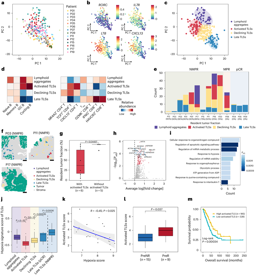 (a) 所有样本中所有 TLS 的 PCA 可视化。(b) TLS 相关标记基因表达的 PCA 可视化。(c) 所有TLS 的k均值聚类和注释的 PCA 可视化。(d) 热图显示不同 TLS 状态下 B 细胞(左)和 T 细胞(右)亚型的富集。(e) 所有样本中不同状态下 TLS 的分布。(f) 三个无应答者的肿瘤样本中不同阶段 TLS 的空间分布。(g) 箱线图显示非 pCR 组中有和没有激活 TLS 的患者之间残留肿瘤分数的差异。(h) 火山图显示 NMPR 组与 pCR 组的晚期 TLS 中的差异表达基因。(i) 条形图显示与来自 pCR 的 TLS 相比,来自 NMPR 的 TLS 中显著升高的基因的富集基因本体-生物过程 (GO-BP) 通路。(j) 箱线图显示不同状态下 TLS 的缺氧特征分数的分布。(k) TLS 评分与缺氧特征评分之间的相关性。(l) TLS 特征评分。(m) TCGA-LUAD 队列的 Kaplan-Meier 生存曲线。