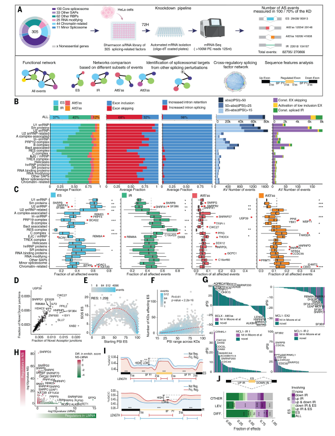 (A) 样本收集和数据分析工作流程概述,包括功能剪接网络重建和应用以揭示 AS 调控机制。(B) AS 变化指标。(C)箱线图说明了在整个数据集中观察到的完整 AS 变化集的分数。(D) 新型 5′(供体)或 3′ 剪接位点(受体)连接的归一化分数图。(E) BinHex 图说明了 AS 变化强度与盒式外显子的起始 PSI 值之间的关系。(F) BinHex 图说明了所有 KD 中受调控外显子的 dPSI 范围与调控该事件的 KD 数量之间的关系。(G) 条形图表示 BCLX Alt5′ss 选择、MCL1 外显子 2 跳跃和 MCL1 内含子 1 和 2 保留的 SF KD 的排序 dPSI 值。(H) 散点图说明了调节 ES 事件的 SF 在位于两个不同细胞区室的转录本中的富集。(I) 频繁受到调节(Frq. Reg.)变化的外显子和内含子中最具统计学意义的差异序列特征的示意图。(J) 堆积条形图显示由两个内含子和一个外显子组成的单位的可能剪接结果的分布。