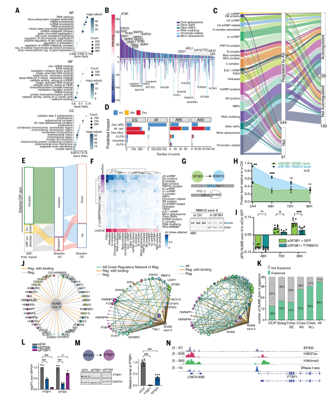 (A)GO分析。(B) 条形图说明在单个 SF 的 KD 时受 AS 影响的 SF 基因数量(上方y轴)以及 KD 影响单个 SF 的 SF 数量(下方y轴)。(C) 桑基图说明 SF 类别的调节模式,表明在 SF KD 时受 AS 调节(或不受 AS 调节)的 SF 基因数量,无论是自动调节还是非自动调节。(D) 条形图显示了 SF 基因中发生的 AS 事件对 SF KD 的预测影响。(E) 桑基图显示了 SF 基因中 AS 事件对 SF KD 对 ORF 的预测影响、AS 变化的方向以及对基因表达 (GE) 的影响之间的关系。(F) 热图显示了属于不同类别的 SF 之间的交叉调节聚类。(G) SF3B1 KD 时,基因RBM10的外显子 6(EX6)跳跃,导致产生过早终止密码子 (PTC),这可能使 mRNA 受到无义介导的 mRNA 衰变降解。(H) 基于蛋免疫印迹的定量结果。(I) 条形图显示 SF3B1 KD 后 NUMB 外显子 9 的“剪接百分比”(dPSI) 的变化。(J) 网络图提供 SF 对 NUMB 外显子 9 纳入调节的多层次概览。(K) 堆叠条形图说明了有助于解释 NUMB 外显子 9 SF 调节剂影响的各种数据层。(L) RT-PCR 分析。(M)免疫印迹分析。(N) 基因组浏览器视图,显示 EP300 的 ChIP-seq 谱以及染色质标记 H3K27ac 和 H3K4me3 以及 HeLa 细胞中 PTBP1 基因座启动子区域的 DNAse I-seq 可及性数据。