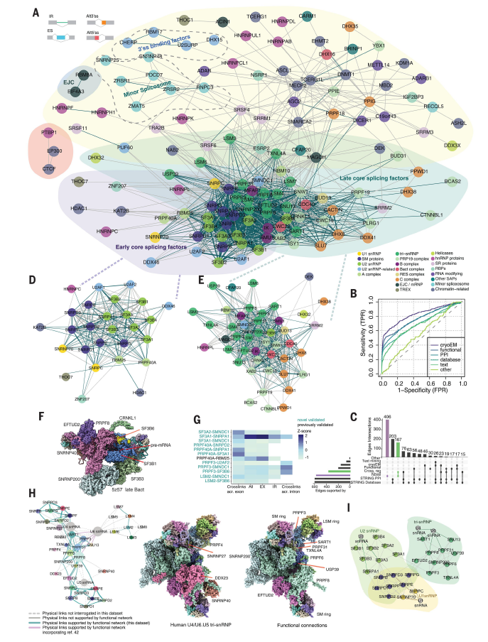 (A) 使用数据集中检测到的所有 AS 事件(ES、IR、Alt5′ss 和 Alt3′ss)重建的功能剪接网络的图形表示。(B) 接收者操作特性 (ROC) 曲线图评估剪接网络中的边缘分类器。(C) 显示跨多个数据源的边缘分类的扰动图。(D) 早期核心 SF 聚类内的详细功能相互作用。(E) 晚期核心 SF 聚类内的详细功能相互作用。(F) Bact 复合物低温电子显微镜结构细节 (5z57),突出显示了 U2 snRNP 成分 SF3B6 和晚期 SF PRPF8之间的物理接触,通过功能网络重建重现。(G) 功能网络连接重现了新近描述的化学诱导蛋白质-蛋白质交联。(H) U4/U6.U5 内的功能连接重现了三 snRNP 的拓扑组织。(I) 涉及 U1、U2 和 U5.4/6 三 snRNP 蛋白成分的功能相互作用。