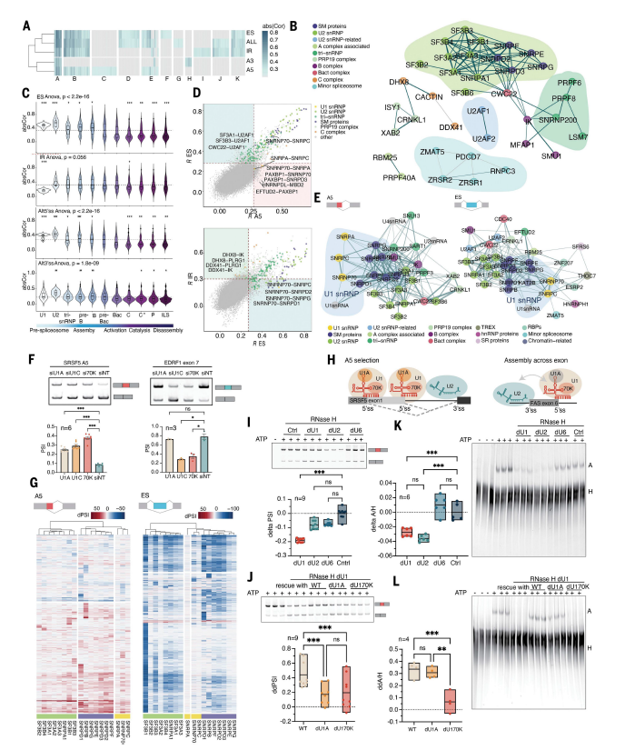 (A) 热图显示不同 AS 类型[包括 ES、IR、Alt5′ss (A5)、Alt3′ss (A3) 及其概要 (ALL)]之间的 SF 功能关联的检测和大小。(B)表示在所有网络类型中一致存在的连接。(C) 小提琴图显示了剪接体循环各个阶段的核心连接强度。(D) 散点图比较了 ES 与 Alt5′ss 网络和 IR 与 ES 网络中 SF 之间的功能性连接强度。(E) 基于 Alt5′ss 和 ES AS 事件的网络显示 U1 snRNP 复合体成分的第一和第二邻居之间的功能连接。(F) 半定量 RT-PCR 检测验证 U1A、70K 和 U1C 成分在 Alt5′ss 和 ES 事件中的不同作用。(G) U1 snRNP 蛋白 U1A、U170K 和 U1C 的 KD 对 Alt5′ss 和 ES 的转录组范围差异效应热图。(H) U1 或 U2 snRNP 在底物剪接位点上的占有率示意模型,用于体外测定直接测试 U1 snRNP 蛋白对 Alt5′ss 选择和跨外显子的相互作用。(I) 使用 SRSF5 pre-mRNA 中的 Alt5′ss 事件进行体外 Alt5′ss 选分析。(J) 代表性半定量 RT-PCR 检测和定量添加所示 U1 snRNP 颗粒后近端 5′ 剪接位点利用率 (ddPSI) 变化的差异。(K) 体外剪接体组装试验。(右)代表性剪接体组装试验检测在对照 (Ctrl) 条件下和 U1、U2 或 U6 snRNA 失活后在 Fas 外显子 6 RNA 底物上 A(U2 snRNP)和 H(hnRNP 蛋白)复合物的形成。(左)与对照条件相比,A/H 复合物比率变化的箱线图定量。(L) Fas 外显子 6 需要 U170K 而不是 U1A。