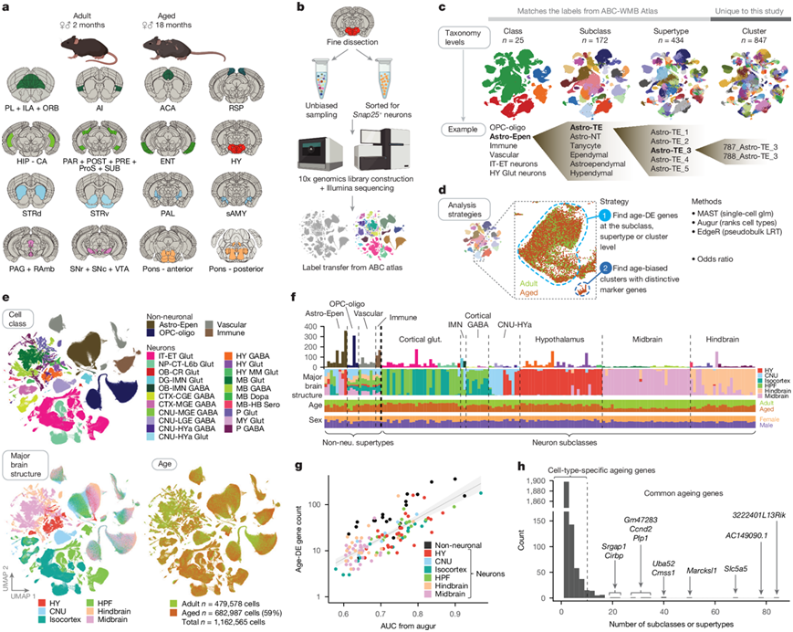 (a) 本研究中解剖的大脑区域示意图。(b) 文库生成和细胞注释工作流程示意图。(c) 基于ABC-WMB 图谱的细胞注释级别图。(d) 用于识别易受衰老影响的细胞类型的一般分析策略示意图。(e) 本研究中包括的所有单细胞转录组的 UMAP 表示,按细胞类别、主要大脑结构和年龄着色。(f) 从每个亚类(针对神经元)和超类型(针对非神经元细胞)中识别出的所有年龄-DEG数量摘要。(g) 所有细胞类型的年龄相关DEG数量与 Augur AUC 评分之间的关系。(h) 细胞类型(神经元亚类)数量直方图。