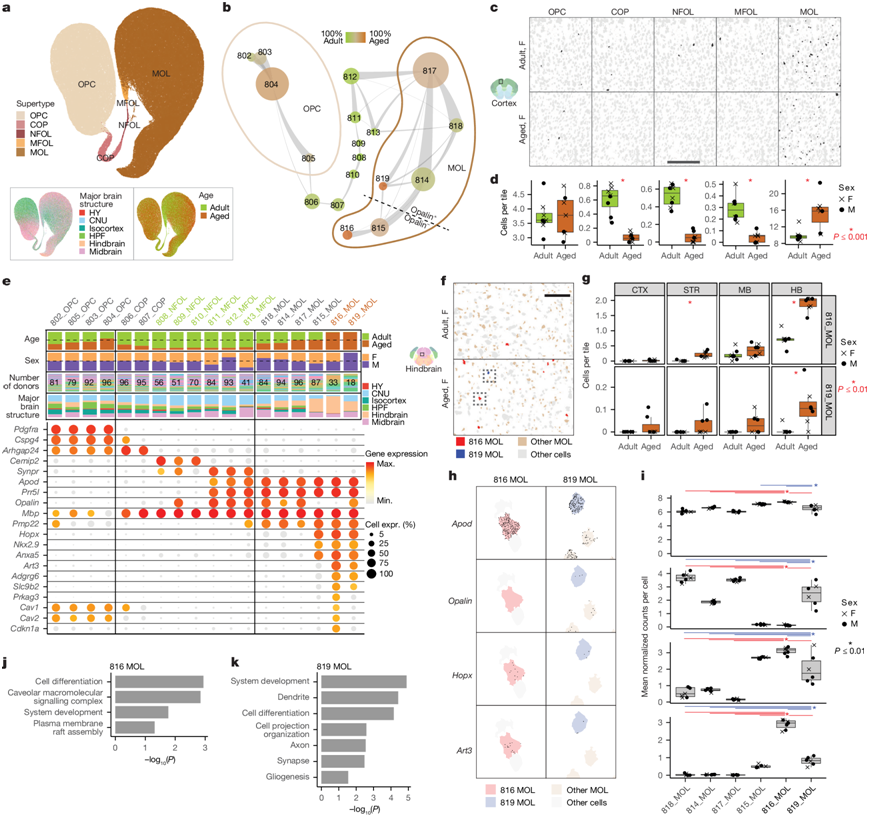 (a) 所有 OPC 和少突胶质细胞转录组的 UMAP可视化。(b) 表示 OPC 和少突胶质细胞聚类的星座图。(c) 来自 RSTE1 的等皮质中代表性样本的 OPC-Oligo 的空间位置。(d) 等皮质中 OPC-Oligo 细胞密度的定量。(e) 每个 OPC-Oligo 聚类按主要大脑结构、性别、供体和年龄的条形图(上)和每个聚类的标记基因的点图(下)。(f) 来自RSTE1的老年和成人后脑代表性样本中衰老富集的 MOL 816 和 819 的原位空间定位。(g) 对 RSTE1 中四个大脑区域中 MOL 816 和 819 的密度进行定量。(h) 显示Apod、Opalin、Hopx和Art3的 mRNA 分子的精确空间位置。(i) 对h中显示的基因在所有 MOL 聚类中的表达进行定量。(j-k)GO分析。