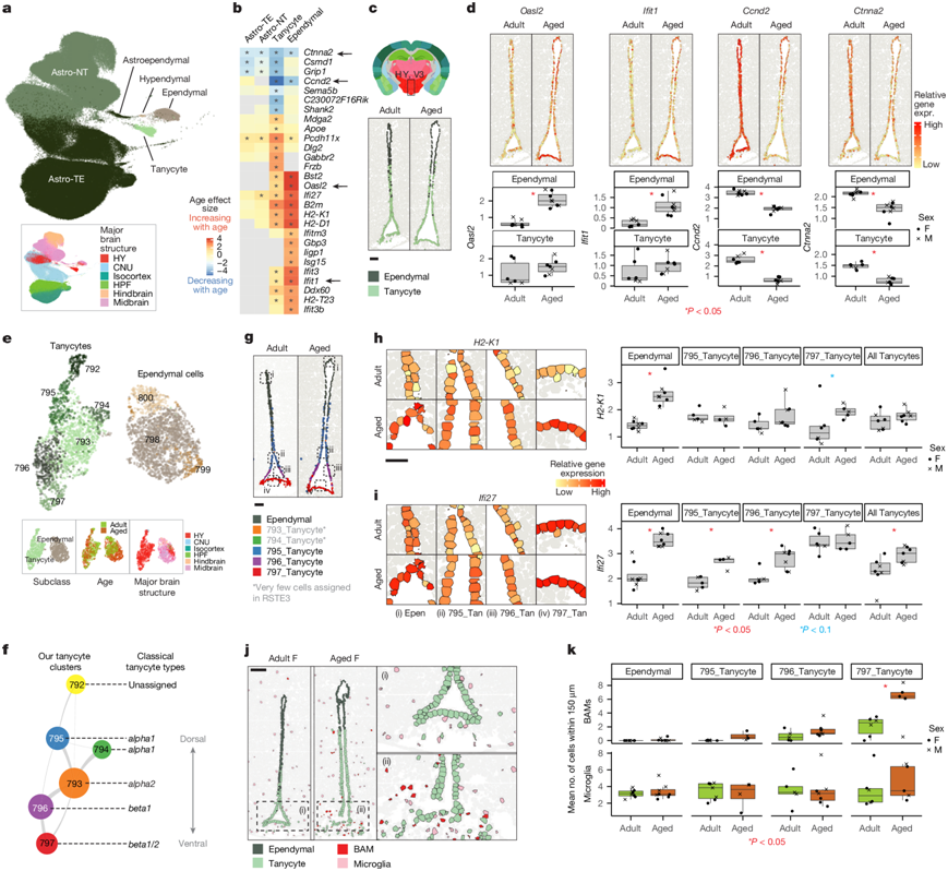 (a) 所有 Astro-Epen 细胞亚类的 UMAP,按亚类和主要大脑结构着色。(b) 伸长细胞和室管膜细胞中DEG的年龄效应大小热图。(c) 来自RSTE3的选定样本中的伸长细胞和室管膜细胞体位置。(d) 来自RSTE3的代表性样本的空间定位以及 V3 中室管膜细胞和伸长细胞中Oasl2、Ifit1、Ccnd2和Ctnna2的相应基因表达定量。(e) 包含 ABC- WMB图谱中额外成体细胞的 tanycyte 和室管膜细胞转录组的 UMAP。(f) (e)中tanycyte 聚类的星座图。(g) RSTE3 示例样本中 V3 中 tanycyte 亚型的空间定位。(h-i) RSTE3 中每个亚型中方框区域的放大图像(左)和H2-K1和Ifi27基因表达的量化(右)。(j) RSTE3 示例样本中 V3 周围免疫细胞的空间定位。(k) 不同 V3 细胞类型 150 µm 范围内的 BAM 和小胶质细胞的平均细胞数。