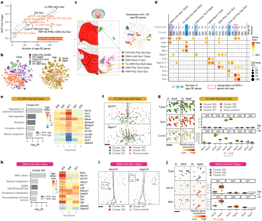 (a) 每个神经元亚类的年龄-DEG数量与 Augur AUC 评分之间的关系。(b-c) 按类别和年龄着色的所有下丘脑 (HY) 神经元的 UMAP。(d) 来自具有最多年龄-DEG的下丘脑神经元亚类的聚类中与摄食行为和能量稳态有关的典型基因表达的点图。(e)GO分析和选定基因的年龄效应大小热图。(f) 来自RSTE4的代表性样本中所有 TU-ARH Otp Six6 Gaba 聚类的空间定位。(g) 按Agrp和Ccnd2的聚类或表达着色的方框区域的放大视图(左),以及来自 RSTE4 的这两个基因的表达的定量(右)。(h)GO分析和选定基因的年龄效应大小热图。(i) RSTE3 代表性样本中所有 DMH-LHA Gsx1 Gaba 聚类的空间定位。(j) 按H2-K1和B2m的聚类或表达(左)着色的方框区域的放大视图,以及来自 RSTE3 的这两个基因的表达的定量。