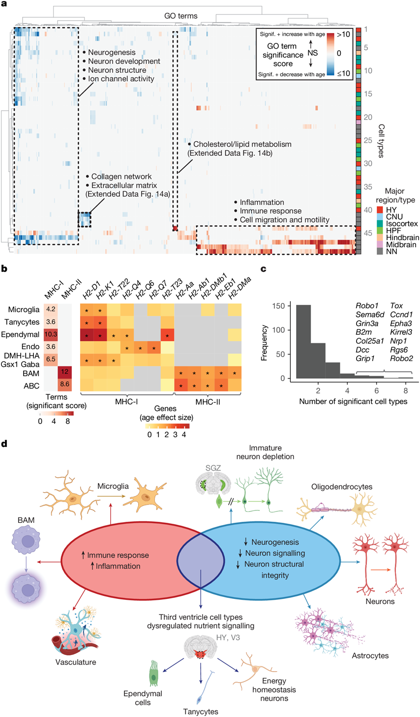 (a)GO分析。(b) 选定细胞类型的 MHC-I 和 MHC-II 活性(左)和选定 H2 基因的年龄效应大小(右)的 GO 重要性得分热图。(c) 属于神经元信号传导或结构术语的基因重要的细胞类型数量分布。(d) 总结了与衰老相关的基因表达变化的主要趋势,包括不同细胞类型的免疫反应增强和神经元功能下降。