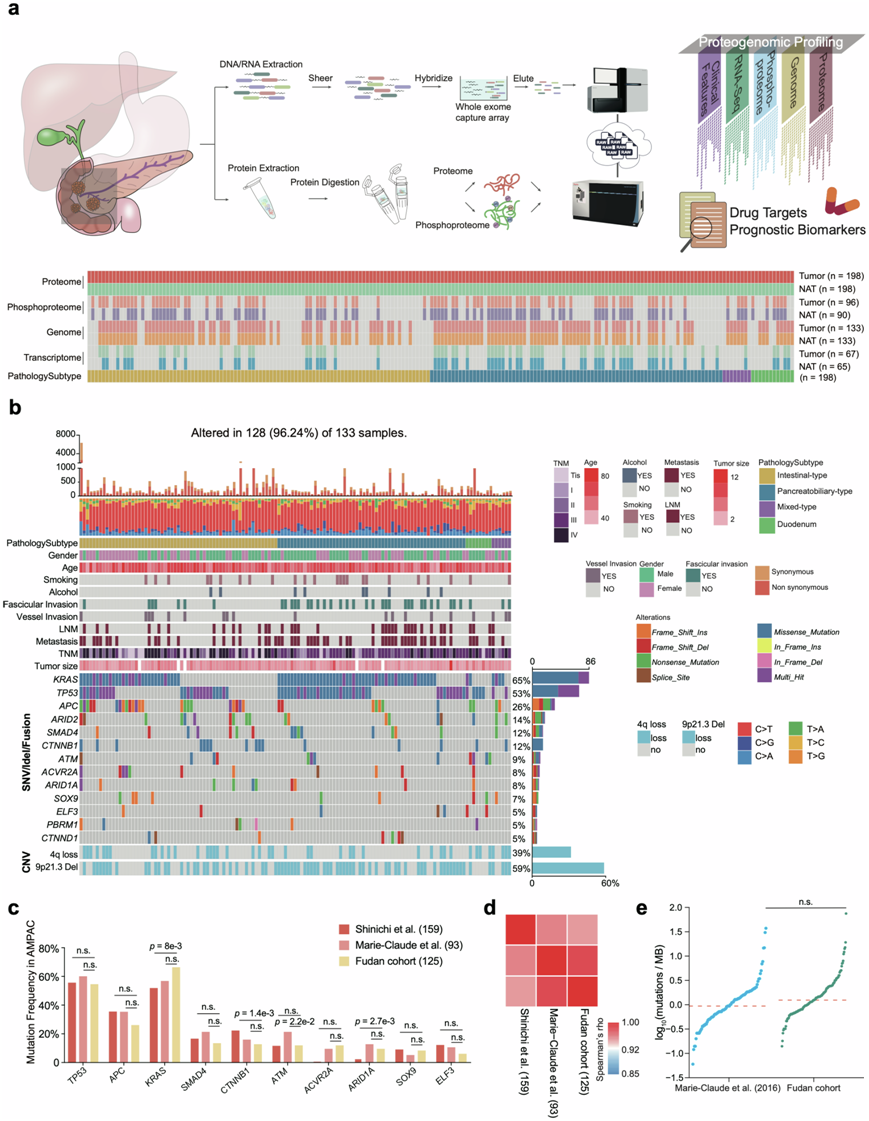 (a) 实验流程。(b) AMPAC患者的显著突变基因 (SMG) 概况和相关临床特征。(c) 复旦队列和之前发表的队列中前 10 个突变基因的突变频率比较。(d) 复旦队列中观察到的突变频率与之前发表的队列相比的相关性图。(e) 不同队列中肿瘤的 TMB 比较。