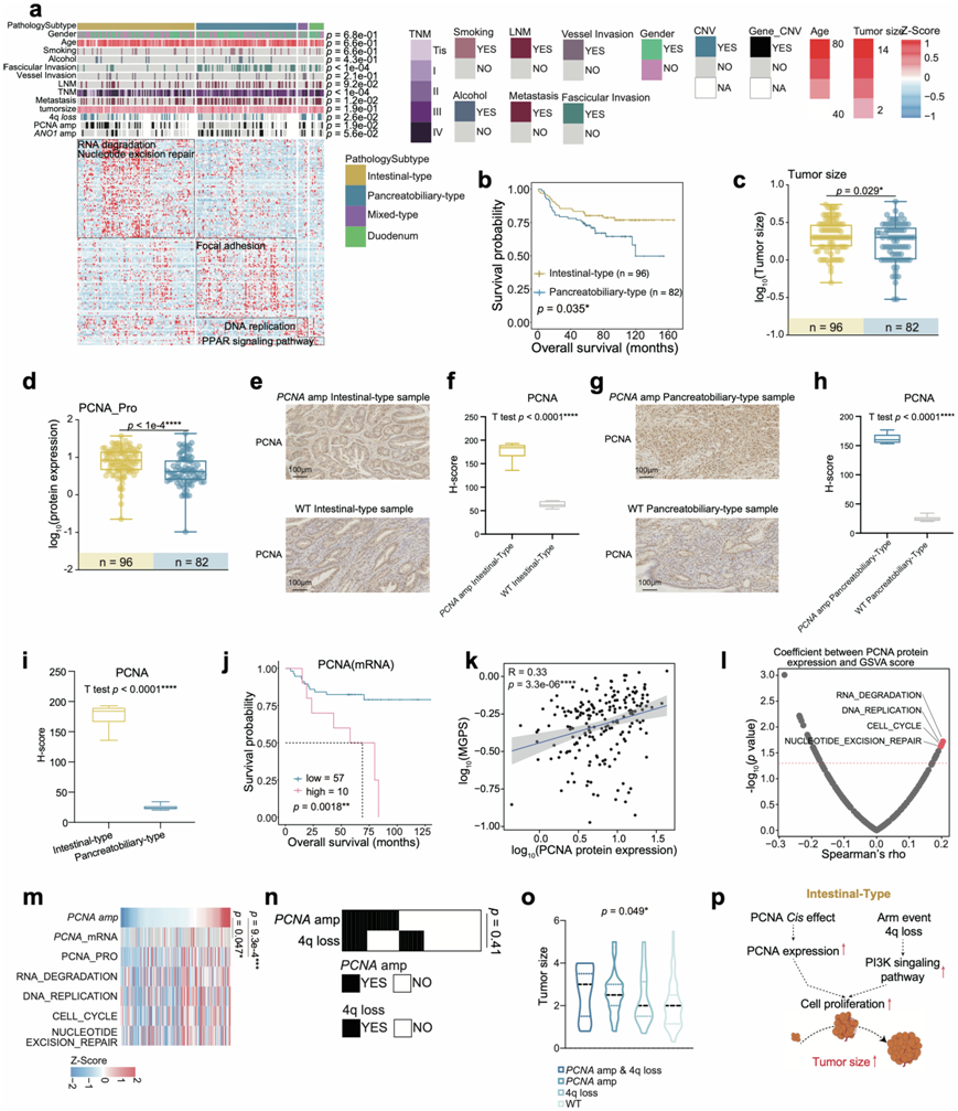 (a) 热图说明了四种病理亚型的特征。(b) 基于病理亚型的总生存率的 Kaplan-Meier 曲线。(c) PCNA扩增状态。(d) 箱线图显示肠型(黄色)和胰胆型(蓝色)之间的肿瘤大小。(e) IHC染色图像显示有和没有PCNA 扩增的肠型样本之间的 PCNA 表达。(f) 箱线图显示肠型样本中 PCNA IHC 图像的 H 分数。(g) IHC染色图像显示有和没有PCNA 扩增的胰胆型样本之间的 PCNA 表达。(h) 箱线图显示胰胆型样本中 PCNA IHC 图像的 H 分数。(i) 箱线图显示肠型和胰胆型样本中 PCNA IHC 图像的 H 分数。(j) 基于PCNA mRNA 表达的总体生存率的 Kaplan-Meier 曲线。(k) PCNA丰度与多基因增殖评分 (MGPS) 的 Spearman 相关性。(l) PCNA 蛋白丰度与 GSVA 评分的 Spearman 相关性。(m) 热图显示了PCNA扩增、PCNA 的 mRNA/蛋白质丰度和 GSVA 评分。(n) 热图显示PCNA扩增和 4q 缺失的 CNV 状态。(o) 小提琴图显示四组肿瘤大小的比较。(p) 说明PCNA扩增的调节作用。