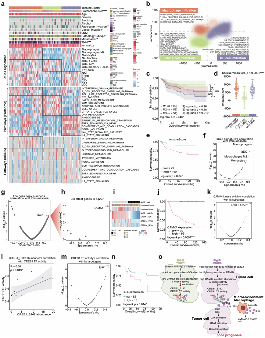 为了探究导致高免疫评分预后不良的原因,他们采用Spearman相关性分析探讨CNV与免疫评分的相关性。发现5q22.1的拷贝数与免疫评分呈显著正相关(图7g)。本研究的GISTIC分析结果将拷贝数变异5q22.1确定为缺失事件。因此,5q22.1缺失多发生在免疫评分较低的患者中。为了研究5q22.1影响AMPAC免疫评分的潜在机制,将重点关注位于5q22.1上的基因拷贝数与其mRNA或蛋白质表达丰度之间呈显著正相关的基因。 CAMK4 的拷贝数与蛋白表达丰度呈最显著的正相关(图7h-i)。由于 CAMK4 位于 5q22.1 上,5q22.1 缺失导致 CAMK 的拷贝数缺失。此外,CAMK4 的拷贝数与其表达丰度呈显著的正相关。换言之,5q22.1 缺失伴随着 CAMK4 拷贝数较低,导致 CAMK4 的表达丰度较低(图7i)。因此,免疫评分高的患者 5q22.1 的拷贝数较高,CAMK4 的拷贝数和表达丰度也较高(图7i)。 CAMK4 编码属于丝氨酸/苏氨酸蛋白激酶家族的蛋白质,在本研究中与OS(图7j)呈负相关。CAMK4 的激酶活性与其蛋白质表达丰度呈正相关。这表明 CAMK4 的高拷贝数提高了其蛋白质表达并上调了其激酶活性。为了探索 CAMK4 的下游信号网络,他们使用 Spearman 相关性检验对 CAMK4 的底物表达丰度和 CAMK4 激酶活性进行了相关性分析。CAMK4 激酶活性显示 CREB1/S142 磷酸化最显著的升高(图7k)。 CREB1 是一种调节多条信号通路的 TF。然后,他们使用GSVA算法根据TG的mRNA表达推断CREB1 TF活性。推断的CREB1 TF活性与CREB1/S142的丰度显示出高度相关性(图7l)。CREB1,IL-6的所有TG均与CREB1 TF活性显示出最高的相关性(图7m)并且与mRNA水平的总体预后呈负相关(图7n)。