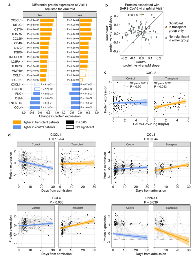 (a) 条形图显示访问1时实体器官移植(SOT)接受者和非SOT对照组血清蛋白的差异表达。(b) 图显示血清蛋白表达对SARS-CoV-2 rpM的斜率。(c) 图显示CXCL8蛋白表达与对照组和SOT组病毒rpM的关系。(d) 散点图显示入院后CXCL11、CCL3、CCL4和IL22RA1蛋白水平的动态。