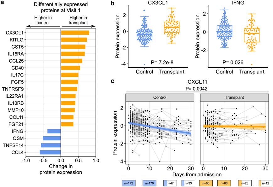 (a) 条形图显示 访视 1 时对照组和移植患者之间差异表达的蛋白质。(b) 箱线图显示访视 1 时 CX3CL1 和 IFNG 水平。(c) 散点图显示入院后 CXCL11 水平的动态变化(未调整 SARS-CoV-2 病毒 rpM)。带状图表示线性混合效应模型拟合的 95% 置信区间。