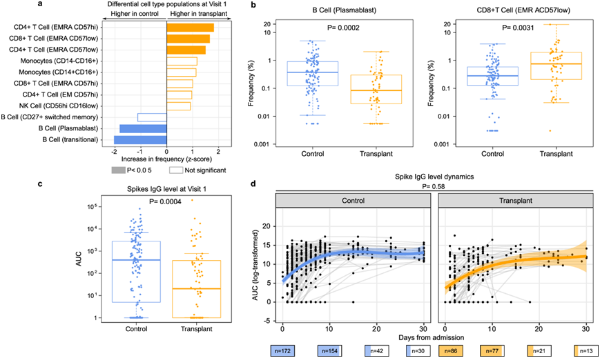 (a) 通过 CyTOF 测量的 SOT 接受者和对照组(蓝色,n = 107)的免疫细胞群频率差异。(b) 箱线图 突出显示了 SOT 接受者和对照组之间频率不同的两种细胞类型。(c) 通过曲线下面积 (AUC) 测量 SOT 接受者和对照组的尖峰 IgG 水平的箱线图。(d) 住院期间 SOT 接受者和对照组的尖峰 IgG 水平的纵向动态。