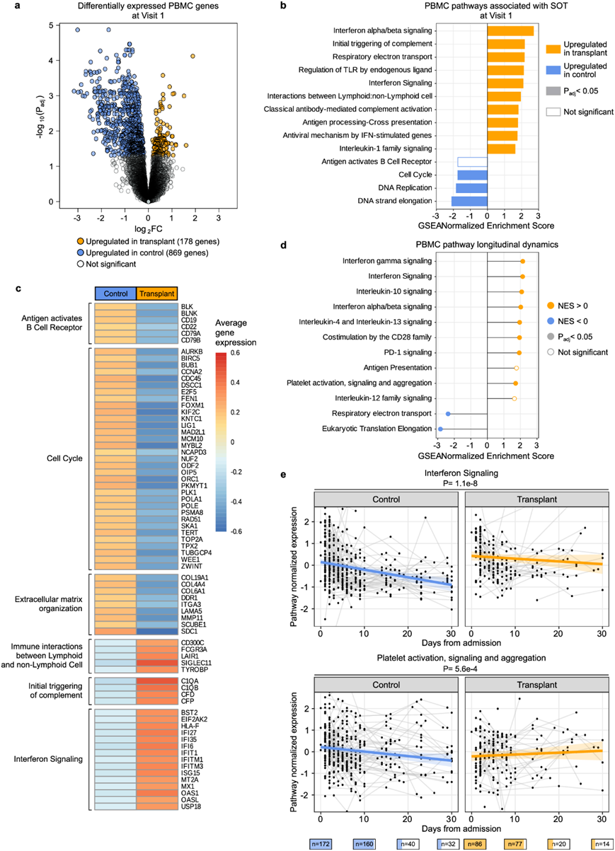 (a) 火山图突出显示了 住院时SOT 接受者和对照组之间差异表达的基因。(b) 基因集富集分析(GSEA)突出显示了 SOT 接受者与对照组中差异富集的通路。(c) 来自重要 GSEA 途径的前沿基因的平均基因表达图。(d) 信号通路纵向动态的差异。(e) 纵向图突出显示了SOT接受者与对照组中代表性免疫信号通路标准化表达的变化,这些变化随时间而显著不同。