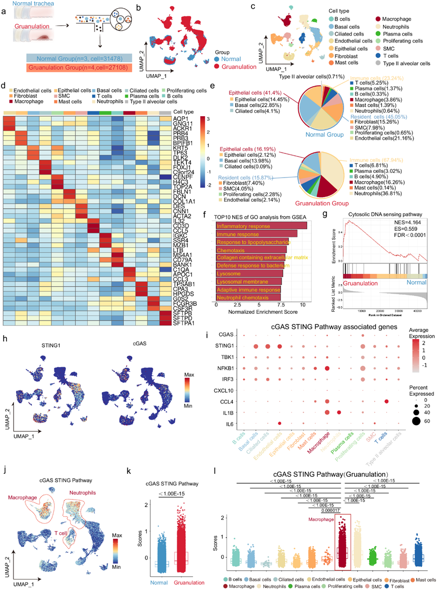 (a)实验设计的示意图。(b) 正常组和颗粒化组(共 58586 个细胞)的 UMAP 可视化。(c) 14种细胞类型(共 58586 个细胞)的 UMAP 可视化。(d) 每种细胞类型三个代表性标记基因的表达热图。(e) 正常组和颗粒化组中确定的每种细胞类型的总比例饼图。(f) 通路分析。(g) 颗粒化组中与细胞浆 DNA 传感器通路相关的基因集显著富集。(h) UMAP可视化所有聚类中的STING和cGAS表达。(i) 点图显示所有聚类中cGAS-STING 通路 9 相关基因(cGAS、STING、TBK1、NFKB1、IRF3、CXCL10、CCL4、IL1B、IL6)的表达。(j) UMAP 可视化所有聚类中的 cGAS-STING 通路评分。(k) 箱线图显示正常组和肉芽组织组的 cGAS-STING 通路评分。(l) 箱线图显示颗粒组所有聚类中的 cGAS-STING 通路评分。