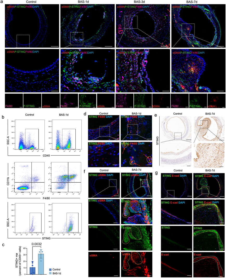 (a) 代表性免疫荧光图像。(b-c) 流式细胞分析图显示气管白细胞(CD45+细胞)中STING+巨噬细胞的百分比。(d) 代表性免疫荧光图像。(e) 免疫组织化学结果表明第 7 天在肉芽阶段的 BAS 小鼠气管中表达 STING。(f-g) 代表性免疫荧光图像。