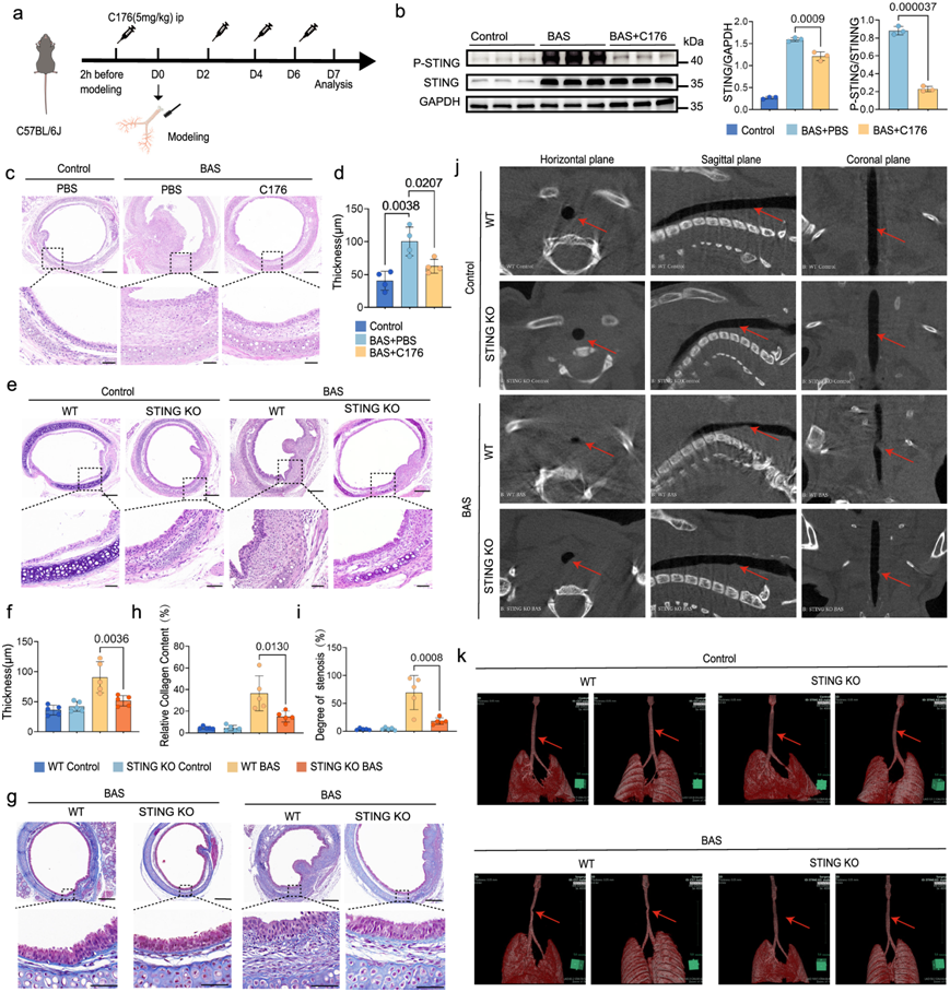 (a) 小鼠接受 C176 处理的示意图。(b)免疫印迹分析。(c) H &E 染色显示对照组、用 PBS 处理的 BAS 组和用 C176 处理的 BAS 组的气管内和固有层状况 。(d) 定量分析表明,与用 PBS 处理的 BAS 组(每组 n = 4 只小鼠)相比,用 C176 处理的 BAS 组的固有层厚度减少。(e) H & E 染色显示 WT 对照组、STING KO 对照组、WT BAS 组、STING KO BAS 组( 每组n = 5 只小鼠)的气管内和固有层状况。(f) 定量比较STING KO BAS组与WT BAS组( 每组5只小鼠)相比气管LP厚度减少。(g-h) 不同组小鼠气管切片Masson三色染色后,STING KO BAS组与WT BAS组(每组5只小鼠)相比胶原相对含量降低。(i) SYNPASE 3D测量气管狭窄面积CT图,结果显示STING KO BAS组气管狭窄面积明显小于WT BAS组。(j) 不同组别的水平面、冠状面和矢状面微CT扫描,红色箭头表示狭窄部位。(k) SYNPASE 小鼠气管 3D 重建,红色箭头表示狭窄部位。