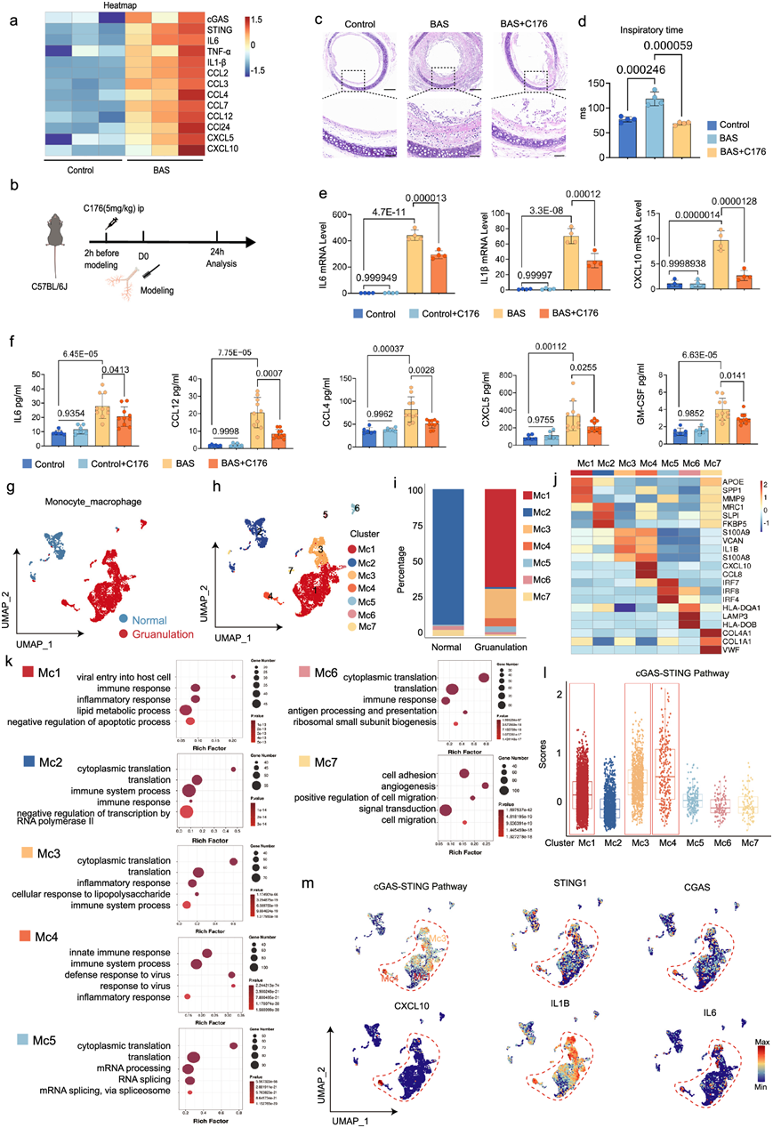 (a) 热图显示气管损伤24小时后,与对照组相比, BAS组上调了与cGAS、STING 和炎症因子有关的基因。(b) 小鼠接受 C176 处理的示意图。(c) 不同组H& E染色的代表性图像。(d) 不同组(每组n = 4 只小鼠)肺功能指标(吸气时间)的定量比较 。(e) 不同组(每组n = 4 只小鼠)气管中IL6、IL1β和Cxcl10的 mRNA 水平 。(f) 不同组别气管炎症因子(IL6、CCL12、CCL4、CXCL5 和 GM-CSF) 的蛋白质水平。(g-h)UMAP可视化。(i) 正常组和颗粒化组中每种类型百分比的条形图。(j) 每种细胞类型的三个代表性标记基因的表达热图。(k)GO分析。(l) 箱线图显示所有聚类中的 cGAS-STING 通路得分。(m) UMAP可视化 cGAS-STING 通路得分以及所有聚类中STING、cGAS、IL1B、IL6和CXCL10的表达。