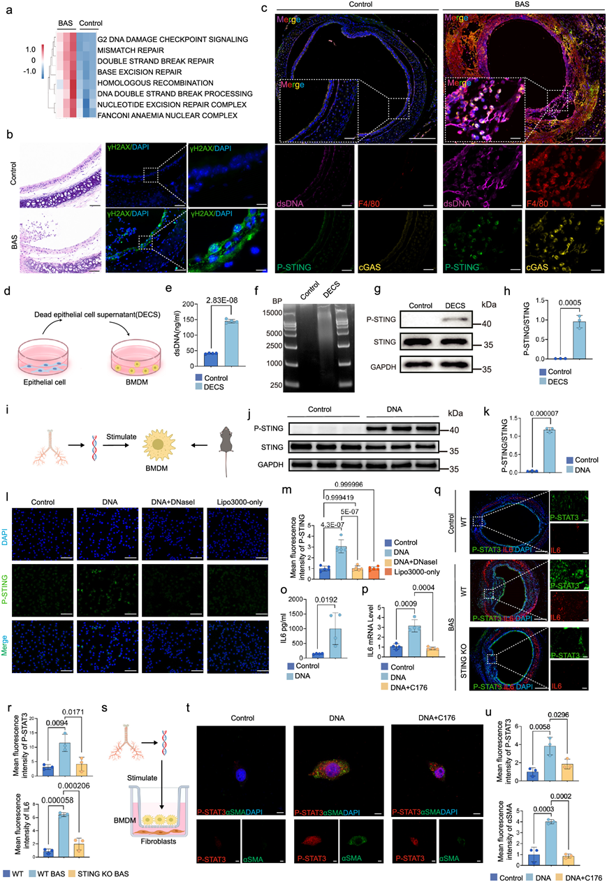(a)GO分析。(b-c) H&E染色和免疫荧光代表性图像 。(d) 使用DECS刺激BMDM的示意图。(e) 对照组和DECS组细胞培养上清液中 dsDNA 的定量分析。(f) 对照组和 DECS 组细胞上清液的 AGAR 凝胶电泳代表性图像。(g-h) 用或不用 DECS 刺激的BMDM组磷酸化 STING 的蛋白质水平。(i) 用 lipo3000 转染小鼠气管 DNA 刺激的 WT 小鼠 BMDM 示意图。(j-k) 用或不用 DNA 刺激的 BMDM 组磷酸化 STING 的蛋白质水平。(l) BMDM中 P-STING(绿色)的代表性免疫荧光图像。(m-n) P -STING 相对平均荧光强度的定量分析。(n) 用或不用 DNA 刺激的 BMDM 组上清液中的 IL6 蛋白水平。(o) 用或不用 DNA 刺激的 BMDM 组上清液中的 IL6 蛋白水平。(p) 对照组、DNA 刺激组和用C176 处理的 DNA 刺激组中IL6的 mRNA 水平。(q-r) 不同组(每组n = 3 只小鼠)的代表性气管免疫荧光图像和 P- STAT3(绿色)和 IL6(红色)平均荧光强度的定量分析。(s) 体外共培养模型的示意图。(t-u) 成 纤维细胞中P -STAT3(红色)和 αSMA(绿色)的代表性免疫荧光图像和平均荧光强度的定量分析。