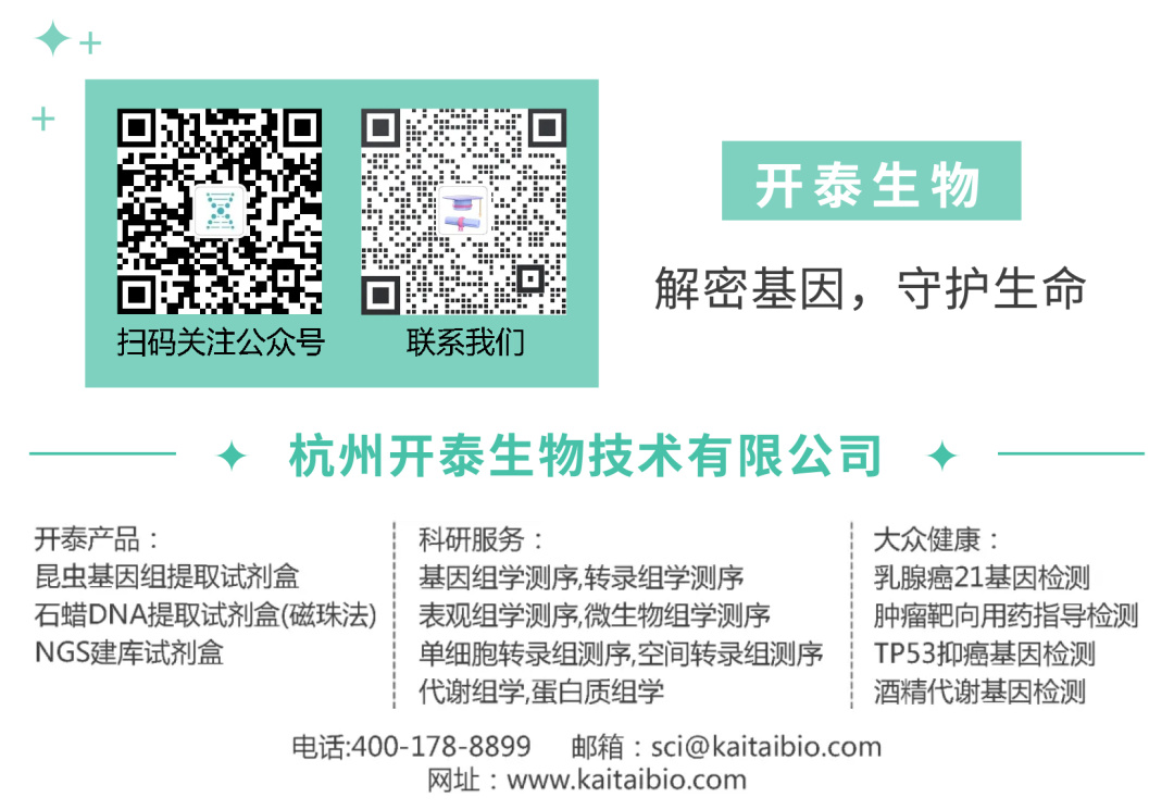 开泰的产品线包括单细胞转录组测序、单细胞多组学测序、空间转录组测序、空间蛋白组测定等单细胞时空组;ATAC-seq、ChIP-seq、m6A(MeRIP seq)、全基因组甲基化等表观组学;Ribo-seq、转录组、基因组和蛋白代谢等科研服务。同时提供NGS建库试剂盒、核酸提取纯化试剂盒,PCR及RT-PCR酶,冻干生物酶等特色产品。开泰代理天根(Tiangen)、Roche、Sigma、Merck、KAPA、CST、Abcam、亲科(Affinity)抗体、Cellbox血清、韦克斯电泳仪、酶免Elisa试剂盒,维思克思外泌体试剂盒等多家世界五百强企业或特色企业产品。产品广泛应用于生命科学、医学、农业-分子育种、制药、环境等领域的基础研究。客户遍布大学、研究所、医院、检验所、血站、出入境检验检疫等单位。在中国大陆大部分省市都设有自己的分公司或办事处。